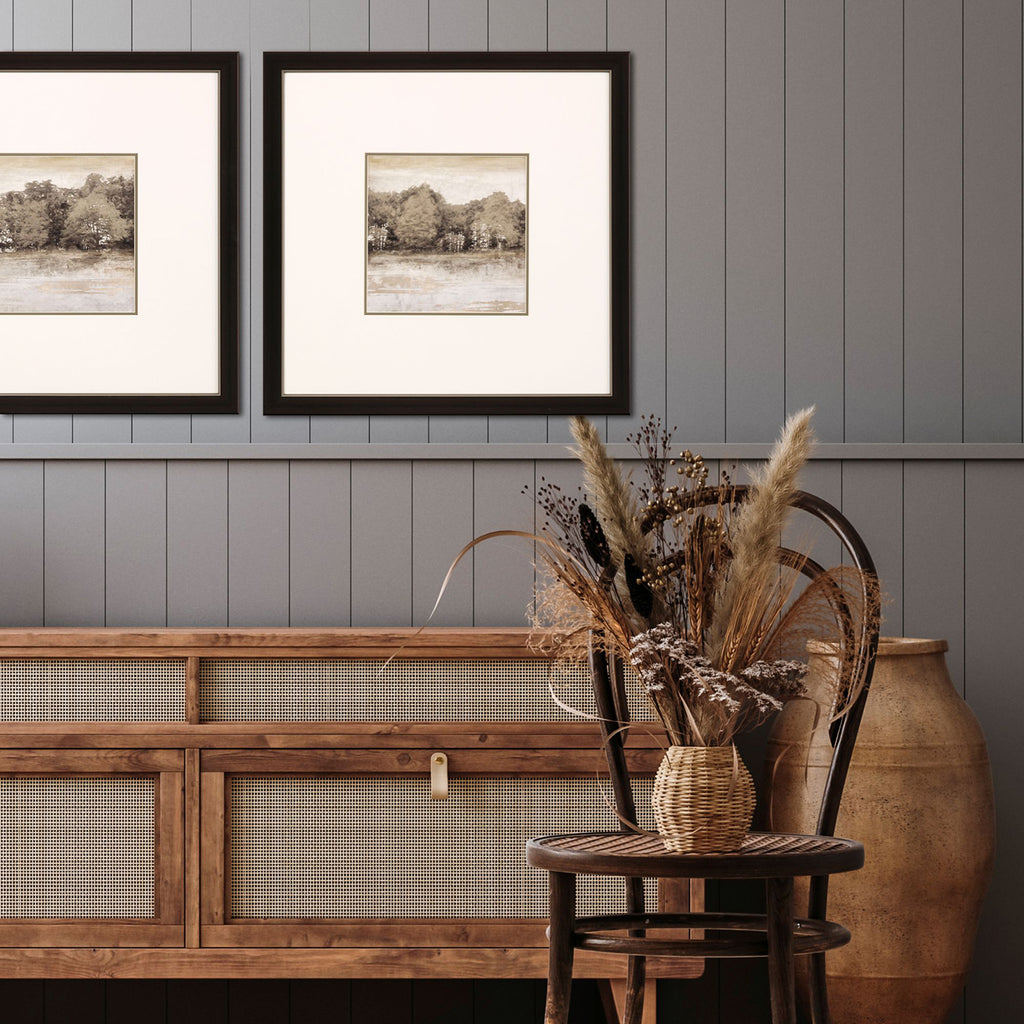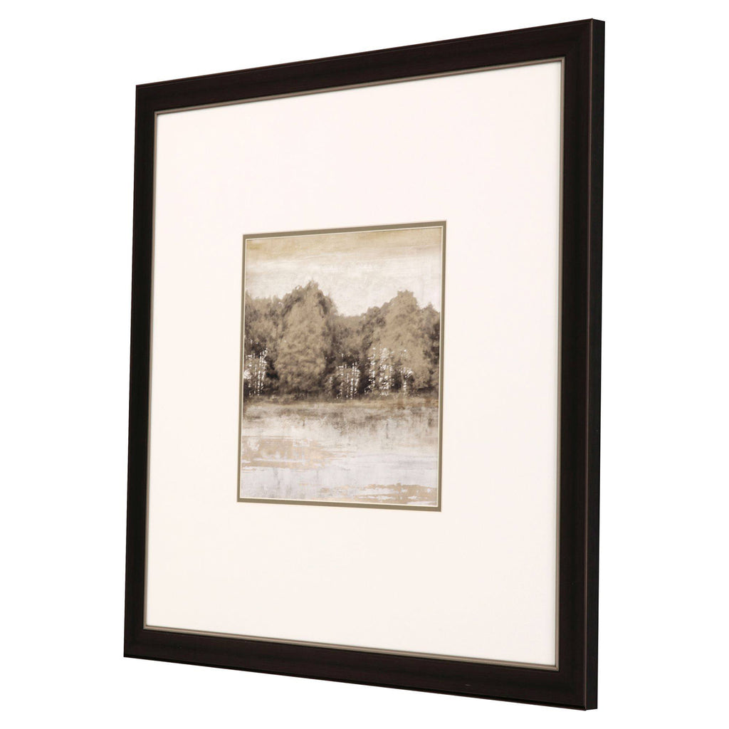 A neutral landscape image accentuated with heavy double matting. These pieces are framed under glass and paired with a dark bronze metallic frame.
