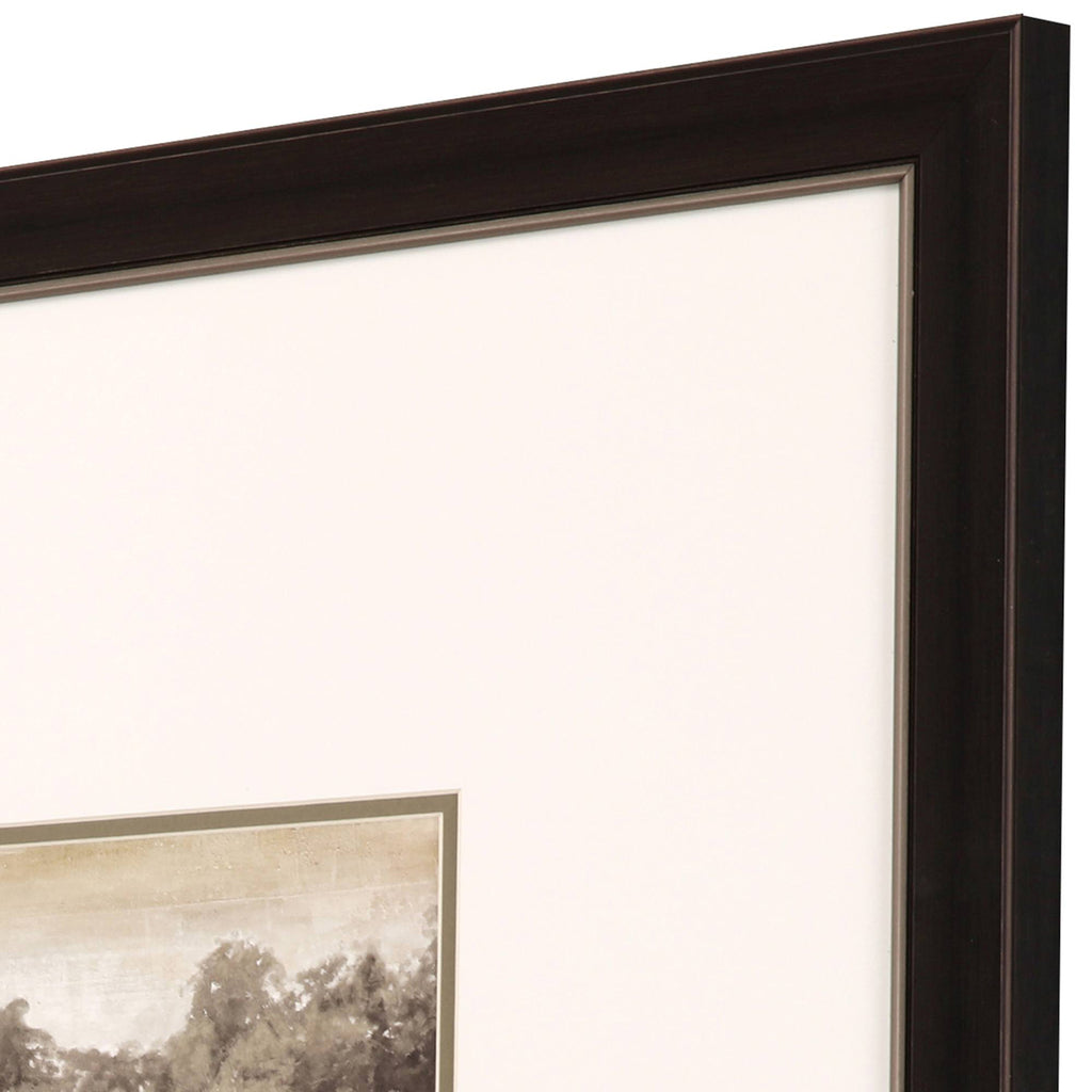 A neutral landscape image accentuated with heavy double matting. These pieces are framed under glass and paired with a dark bronze metallic frame.