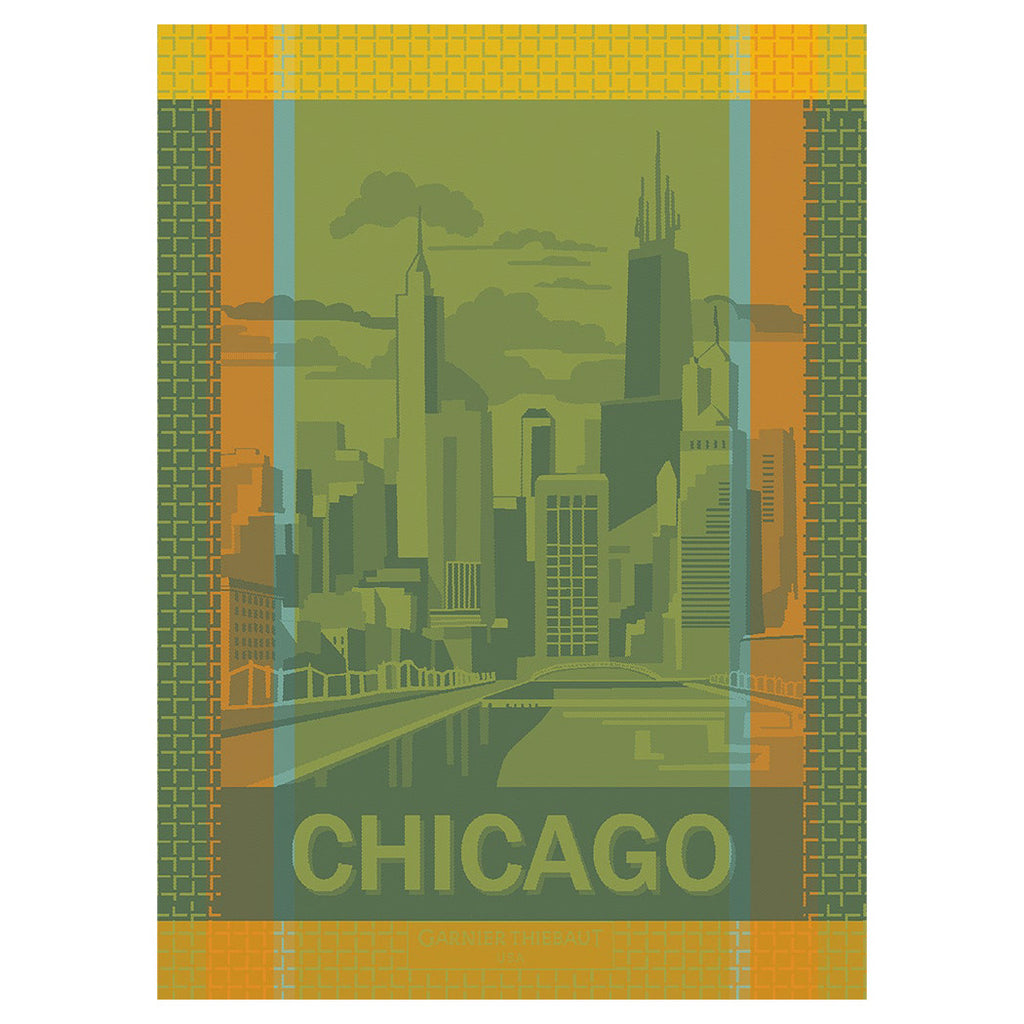 The Chicago Jacquard Kitchen Towel by Garnier Thiebaut captures the spirit of the "Windy City" with vibrant green and yellow hues. Hand-drawn by in-house French artisans and woven from extra-long staple cotton, it combines city-inspired style with lasting durability for your kitchen.