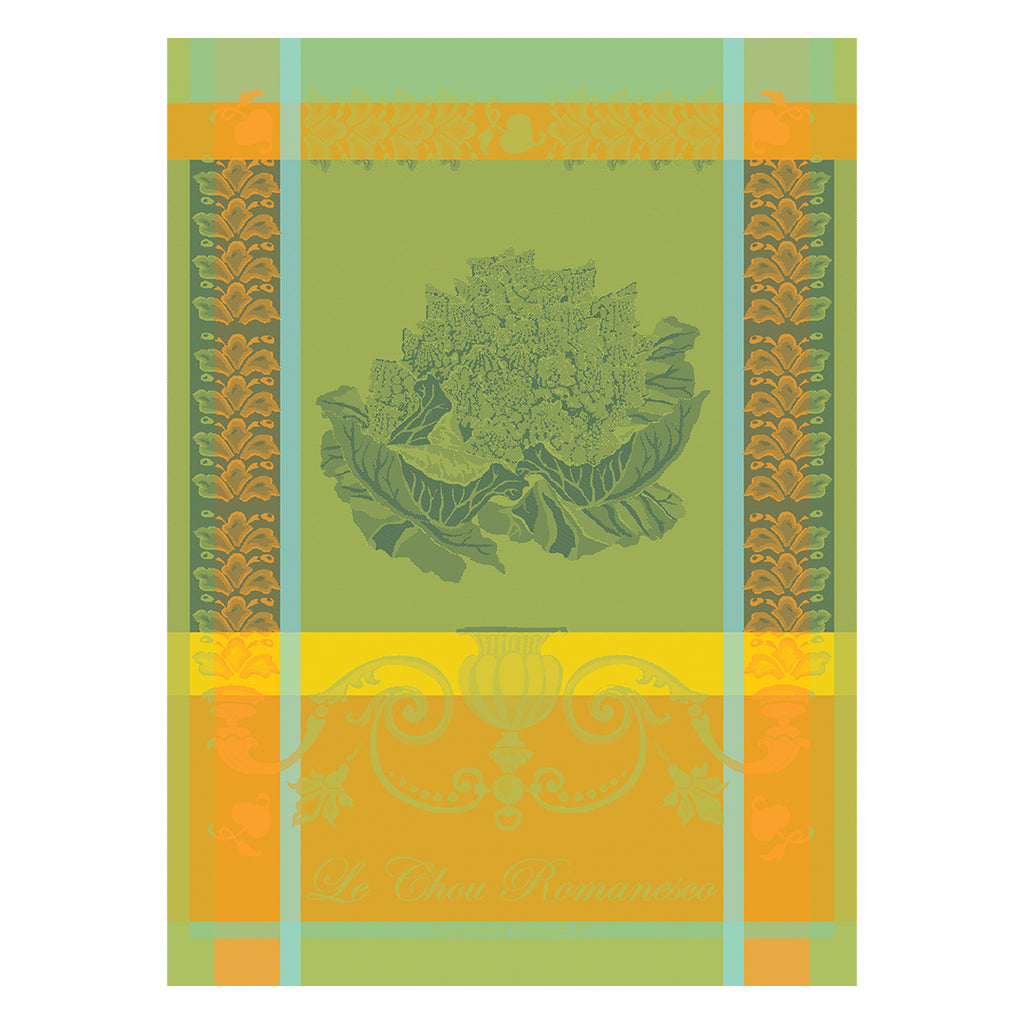 Indulge in the verdant beauty of the leafy, Romanesco broccoli that is sure to make a statement with your Le Chou Romanesco Vert Kitchen Towel in shades of green, yellow, and orange. This woven design was crafted from original artwork, hand-drawn by our in-house team of textile artisans & designers in France. Constructed on jacquard looms with extra long staple cotton, Garnier Thiebaut USA's jacquard kitchen towels are woven for longevity, and can last for generations with the proper washing maintenance and use.