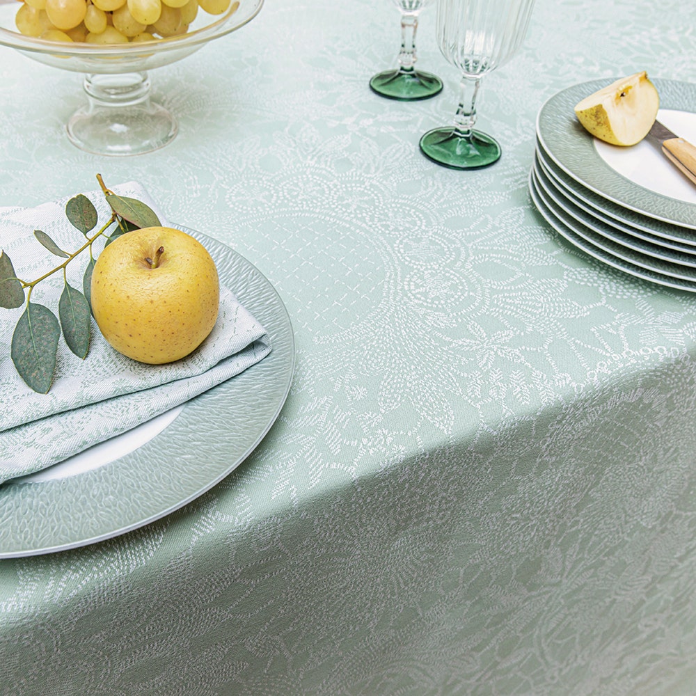 It's design praises the Guipure French lace, created in France in the 1860s in the district of Lorraine. Its particular color has a rich meaning throughout history, emulating good fortune and protective energy. Combinations of jade with earth tones have prevailed in ambiance decoration for centuries but the combinations are endless.