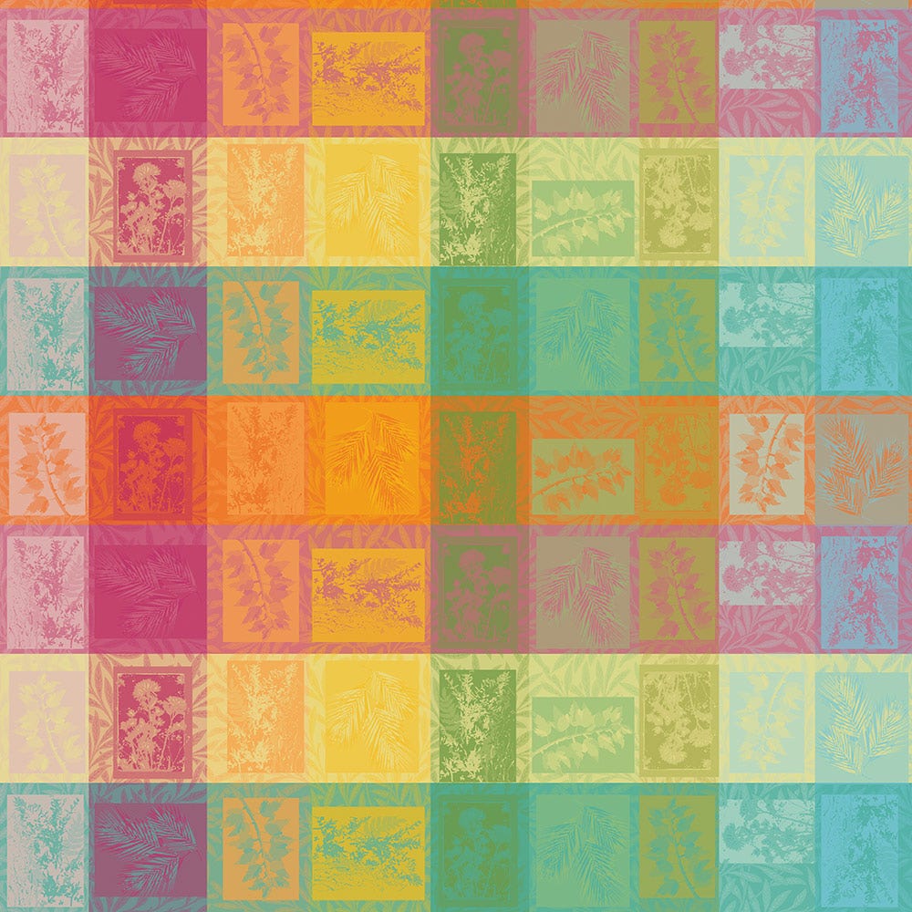 French tablecloth in an explosion of lush colors, living up to its name, Arc in Ciel, or Rainbow. Fucsia, red, green, cyan, purple and yellows come together and create a colorful masterpiece. It feels as a celebration of life, an open invitation to share a meal with friends and family. The vegetation design matches perfectly with its alluring composition.