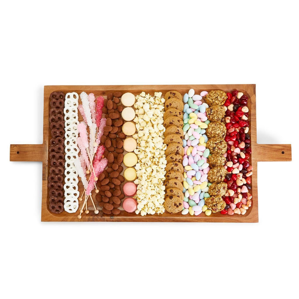 Crafted of beautiful acacia wood, our rustic serving board gives a boost to appetizers, cheese or dessert. Raised on footed legs, the board adds a bit of height to buffet spreads and cocktail table offerings.