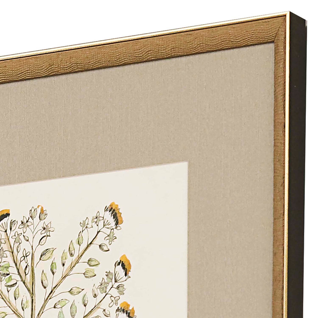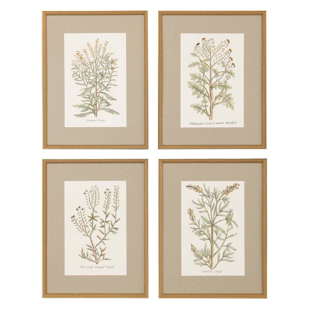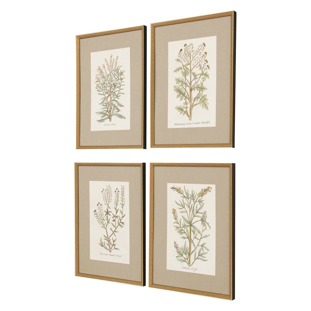 Vintage botanicals feature premium matting. Framed in an antique gold wood with embossed weave pattern. Sold as set of four.