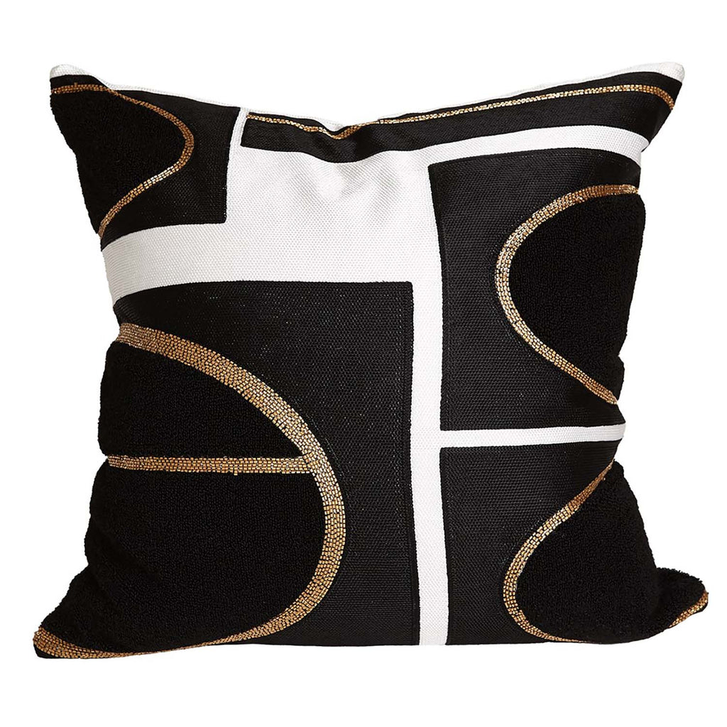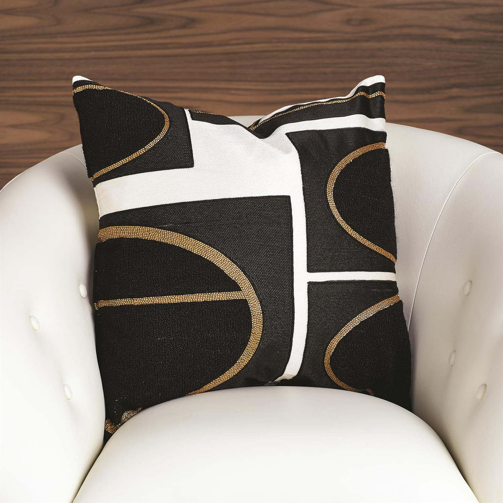 A black and white pattern is interrupted by a brass colored loop. This stunning pillow comes with a luxurious down insert.