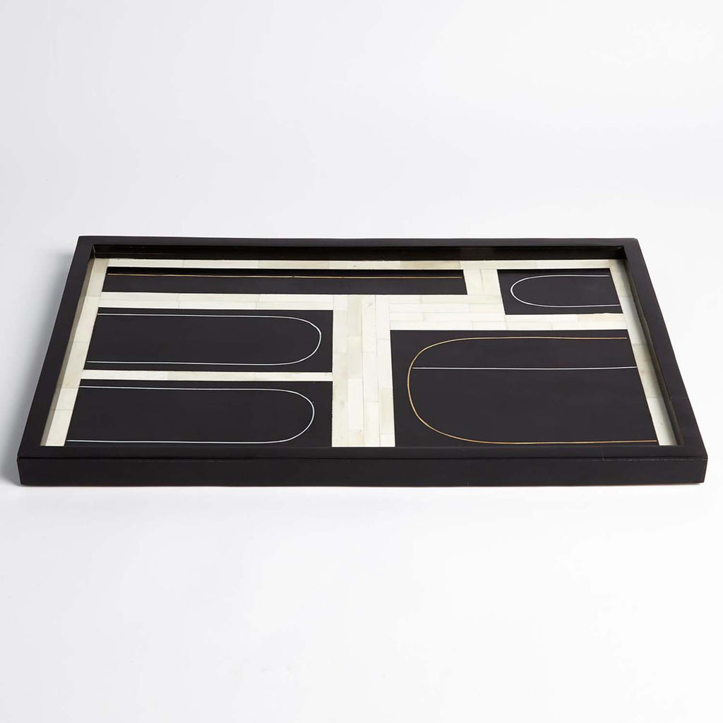 A resin and bone exterior features a brass filet loop that is inlaid. The substrate of MDF gives this tray strength and stability to hold up over time without warping or movement.