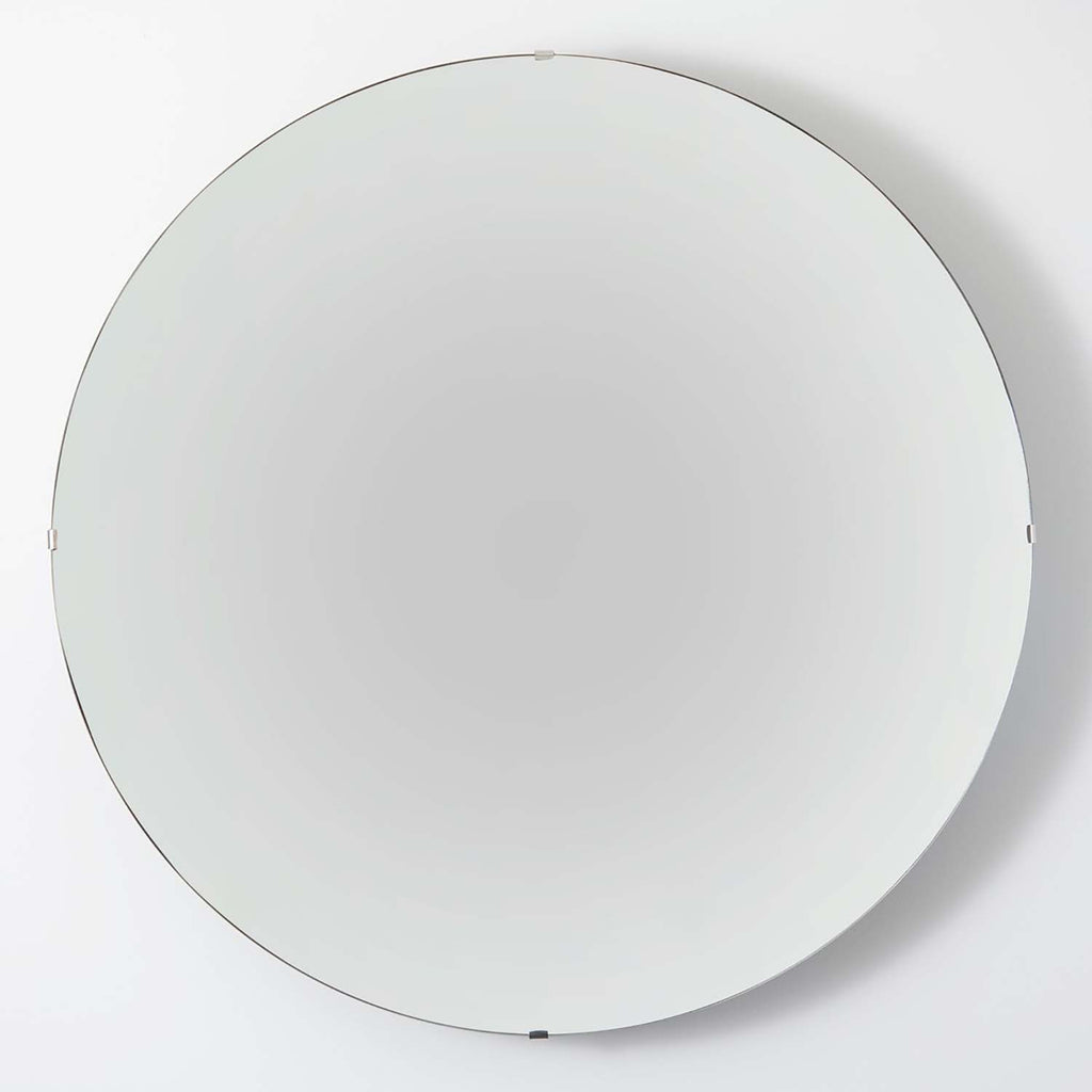 The Global Views Concave Mirror is a singular piece of glass with a concave shape and mirroring on the curves of the back. Walking towards the mirror, you reflection is upside down. Your reflection flips to right-side up and magnified as you walk closer. An industrial-sized hanger on the back disperses the 60 lb weight evenly across the wall cleat.