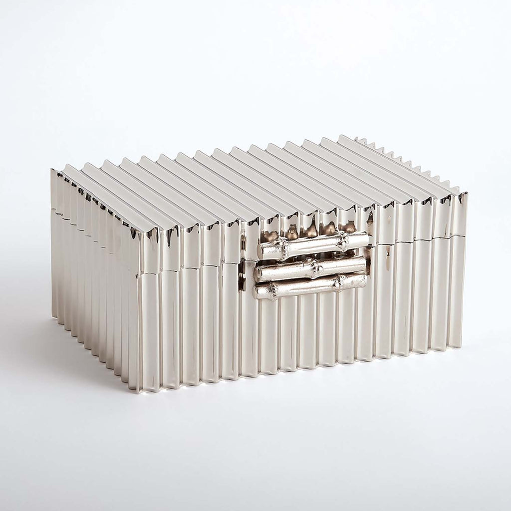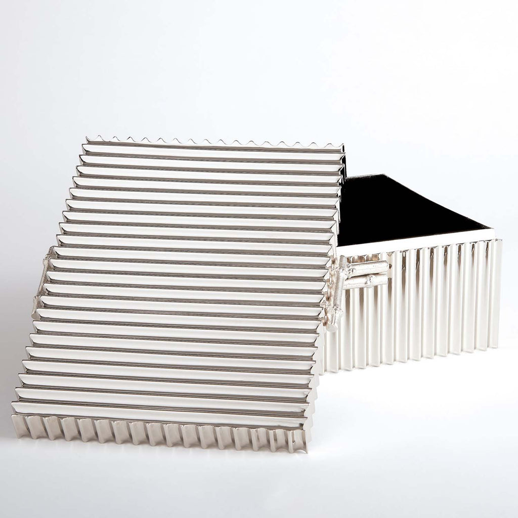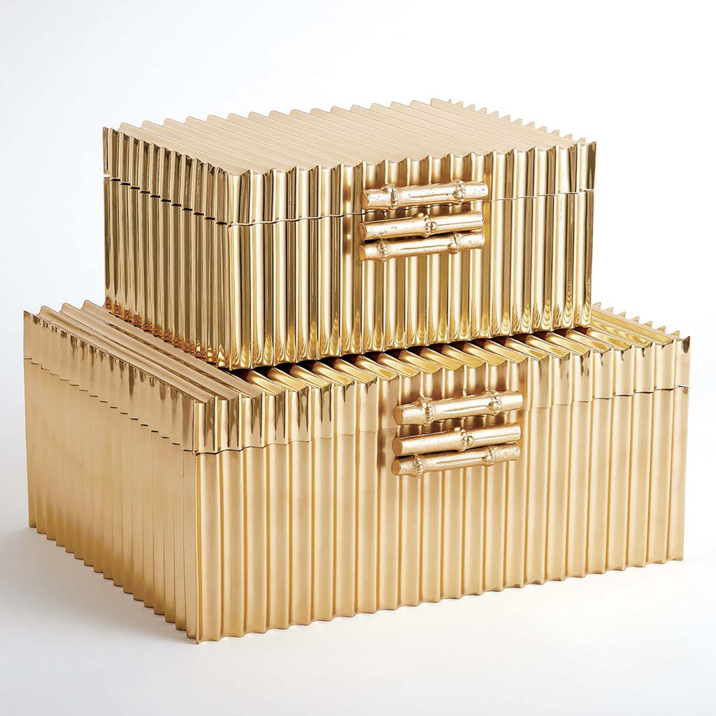 These handmade solid brass boxes are powder coated and lined with black felt. The soldering process is extremely labor intensive to achieve the delicate and perfect flutes that surround this box.