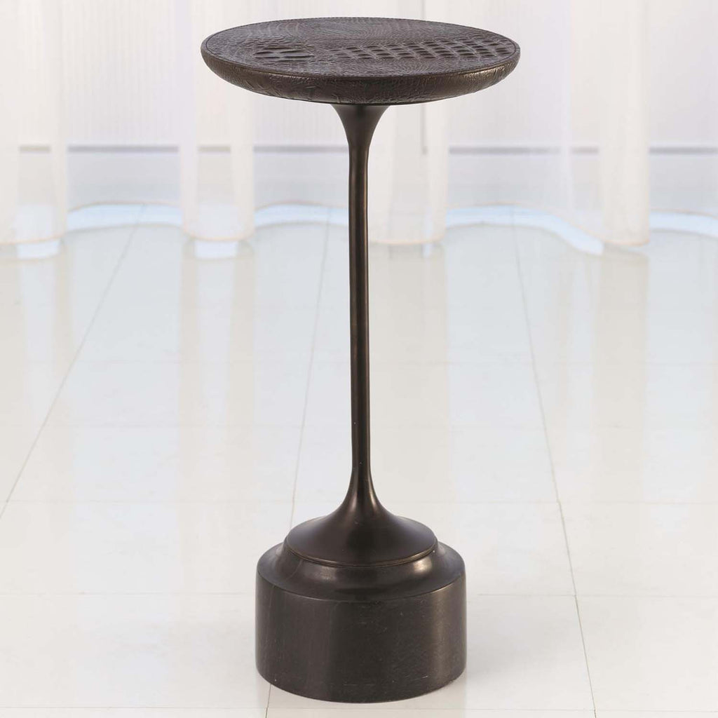 The Global Views Croc Drinks Table embodies old Hollywood with a crocodile hide embossed leather surface that is supported by a bronze finished stem and a solid granite base.