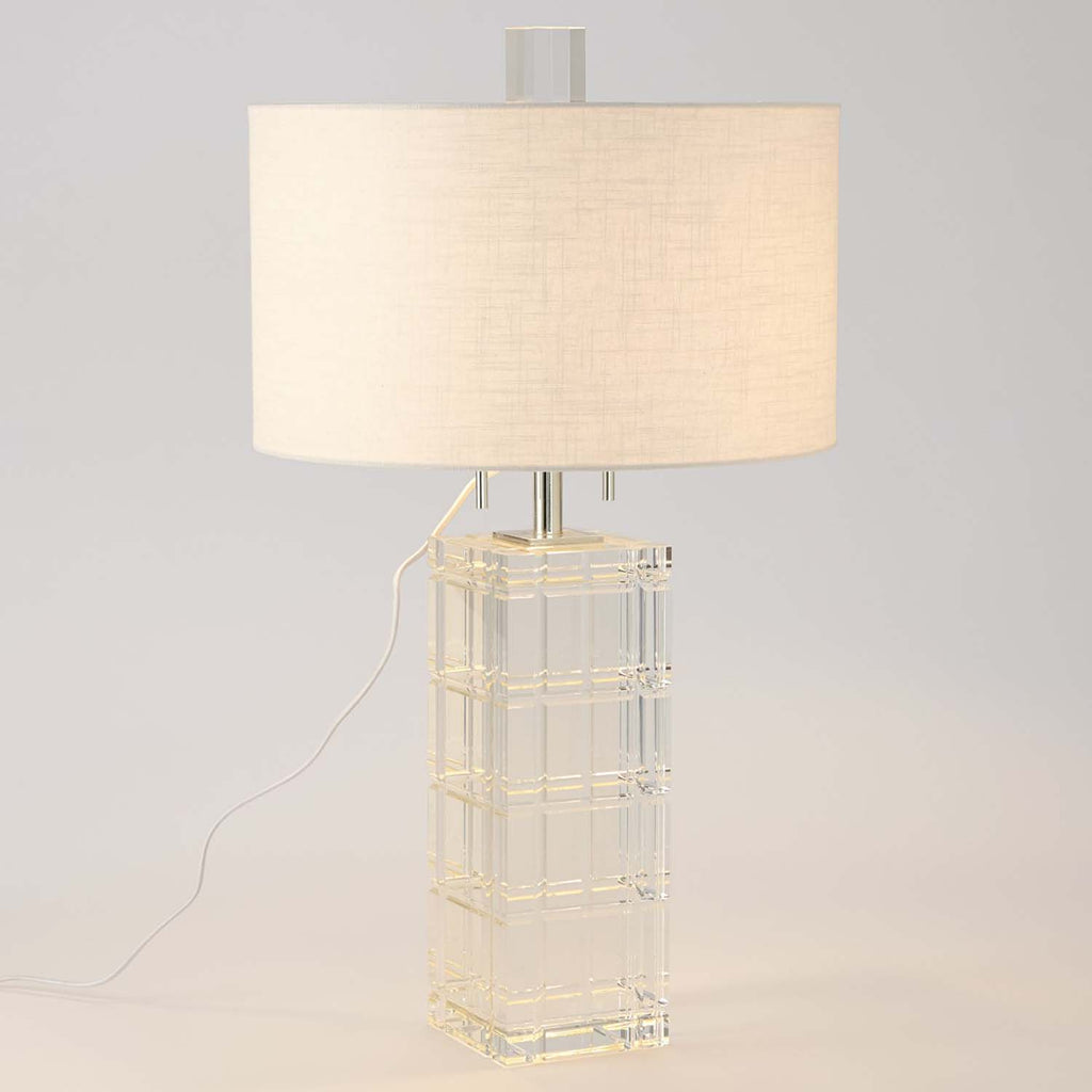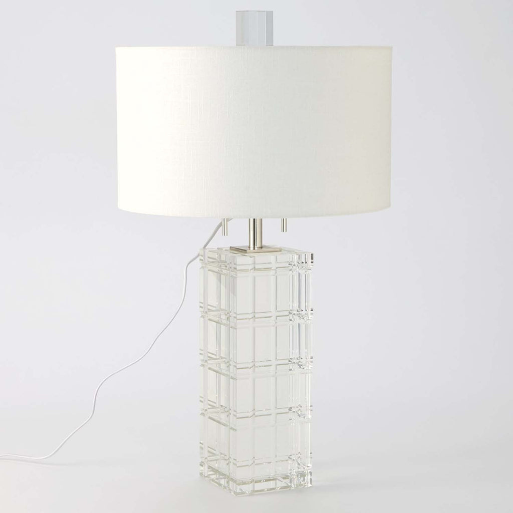 The Global Views Crystal Plaid Lamp is brilliantly cut and polished K9 crystal with a hardback white linen shade.