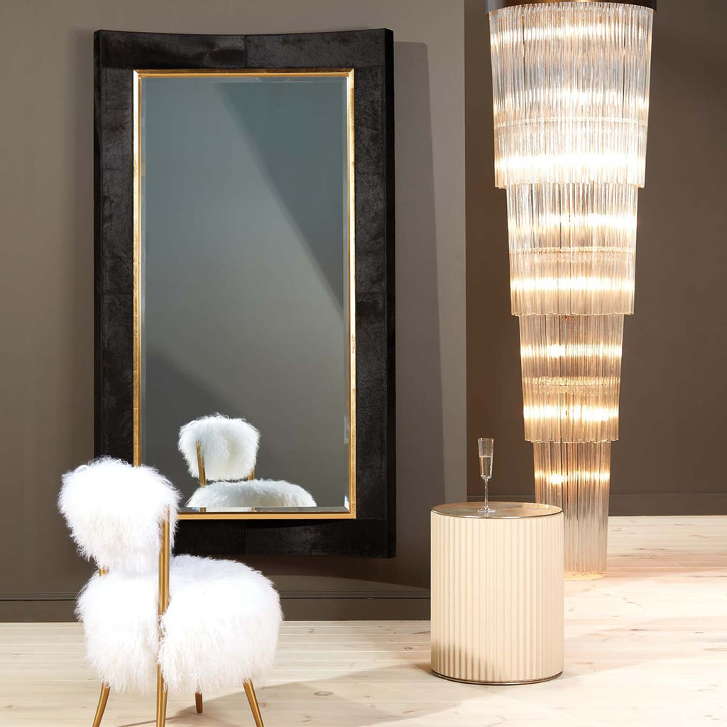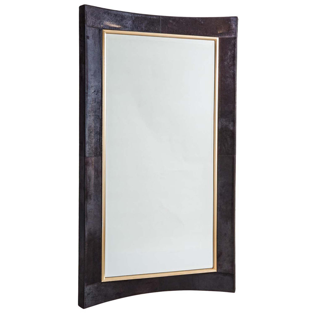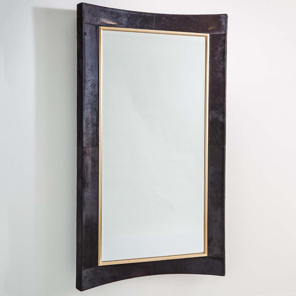 Done in lavish hair on hide, the Global Views Curved Mirror is so simple, yet makes quite a statement. The soft curves of the dusky frame contrasts with the completely flat beveled mirror that is surrounded by a gold leaf wood fillet.