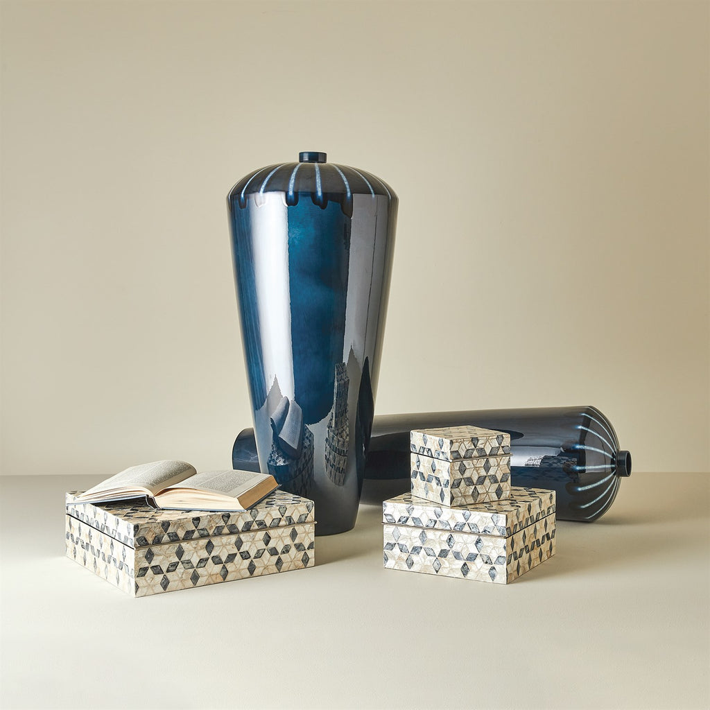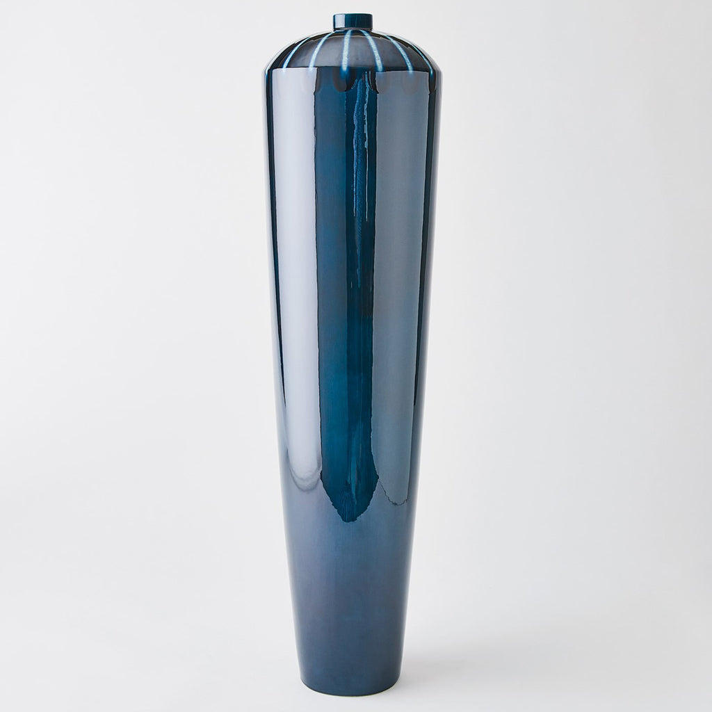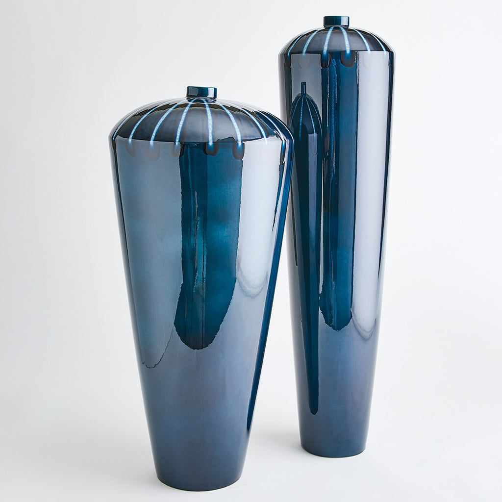 The Domed Vases are expertly crafted from slip-molded Portuguese ceramic. They feature a striking reactive blue glaze and hand-applied striped details. Variances in the finish naturally occur due to the reactive glazes and handmade craftsmanship, making each piece a one-of-a-kind creation.
