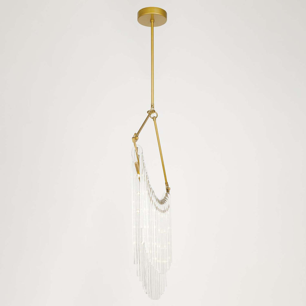 Hand-pulled glass rods elegantly drape over a metal frame with an antique bronze finish, emulating the shape of wet silk fibers drying on a rack. The geometry of the frame creates a modern form contrasted with the old world charm of glass and warm dimmable LED light.
