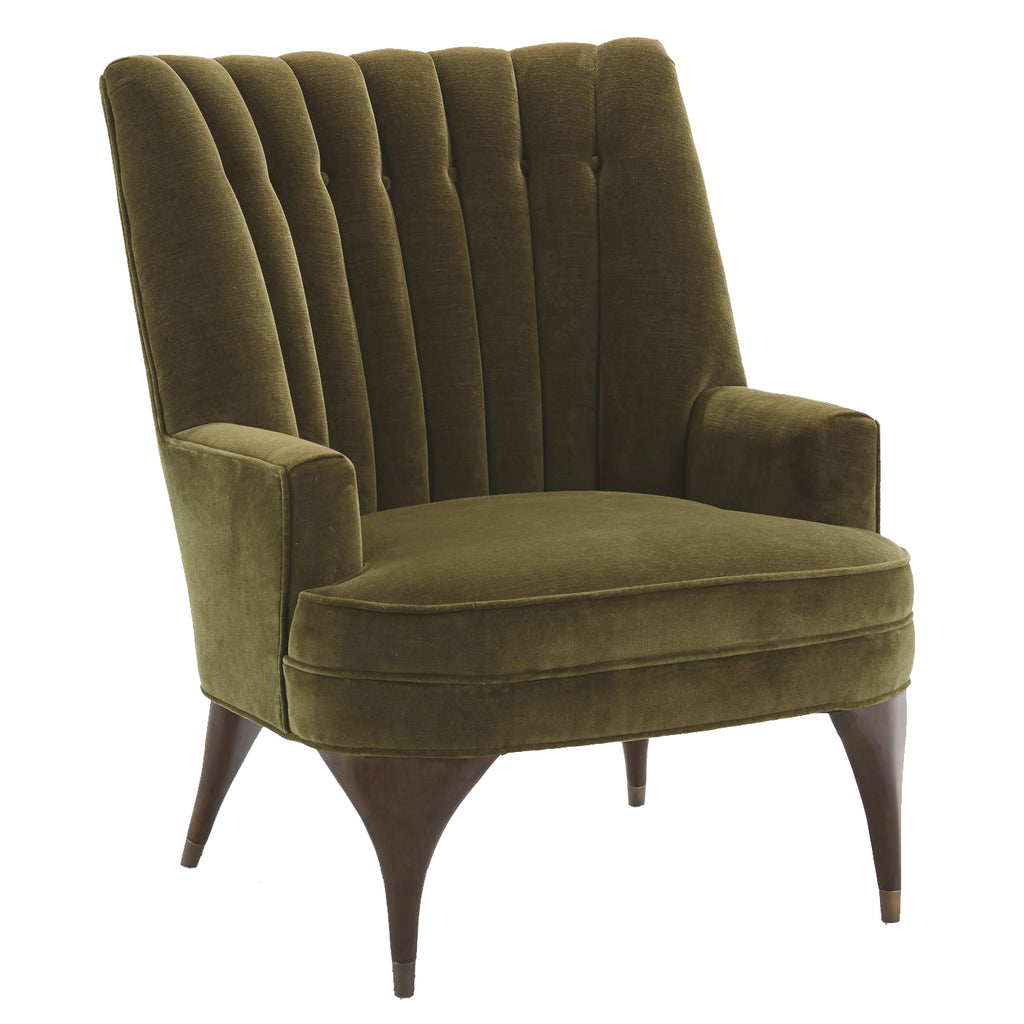 A delicate pale grey woven fabric or mossy green cotton velvet covers the surface of the chair. The back is channel tufted with inset buttons buried deep within the channels. A tight seat and exterior back make for a clean, comfortable seat. The oiled walnut finished rubberwood legs are capped with solid antique brass sabots on all four legs. The leg detail and shape add that extra level of interest such a beautiful chair requires.