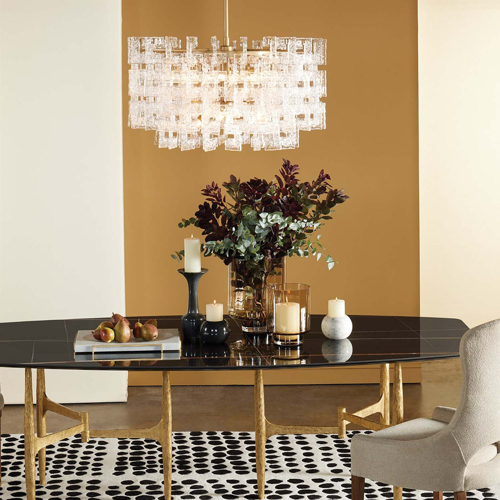 The Global Views Exposition Chandelier is truly a work of art featuring 265 textured cast glass pieces suspended from a brushed brass iron structure.