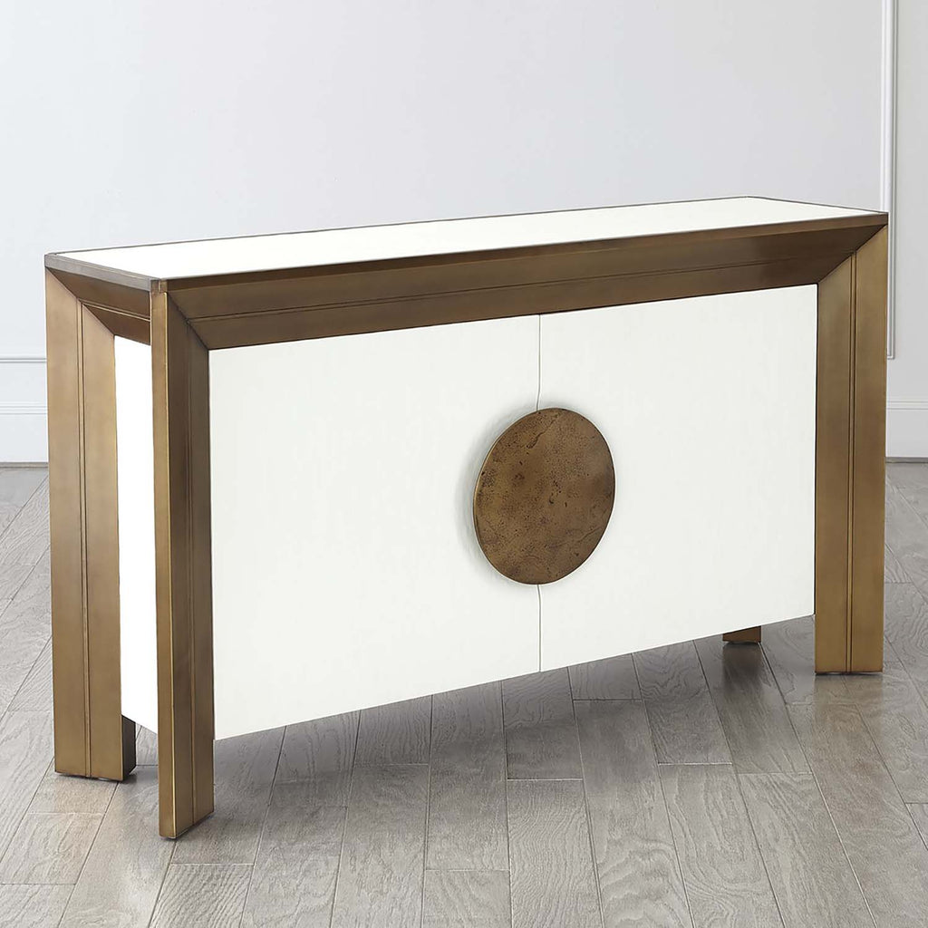 The Global Views Framed Console is made of hardwood construction with brass sheeting and cast resin panels, lined in American white oak with two adjustable shelves.