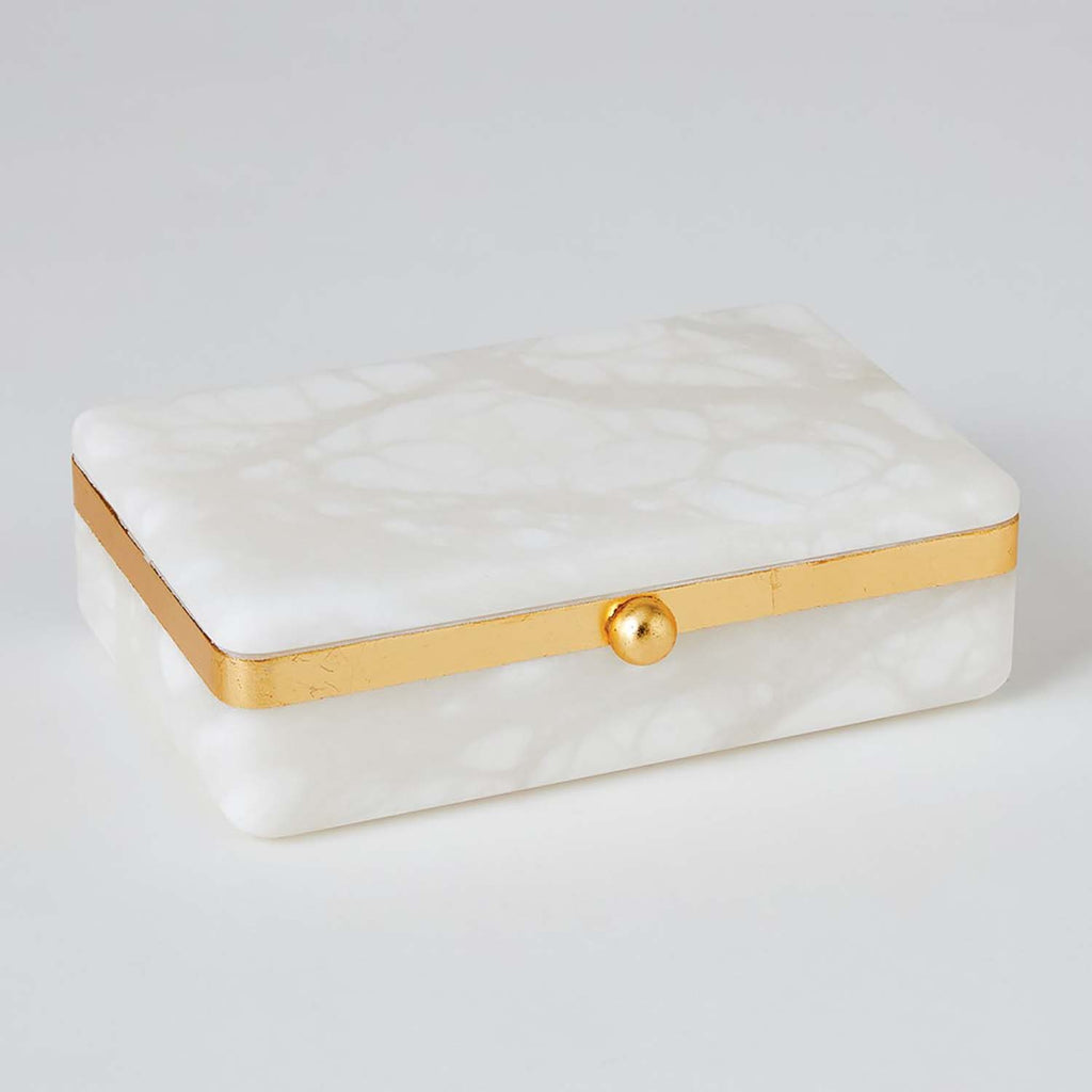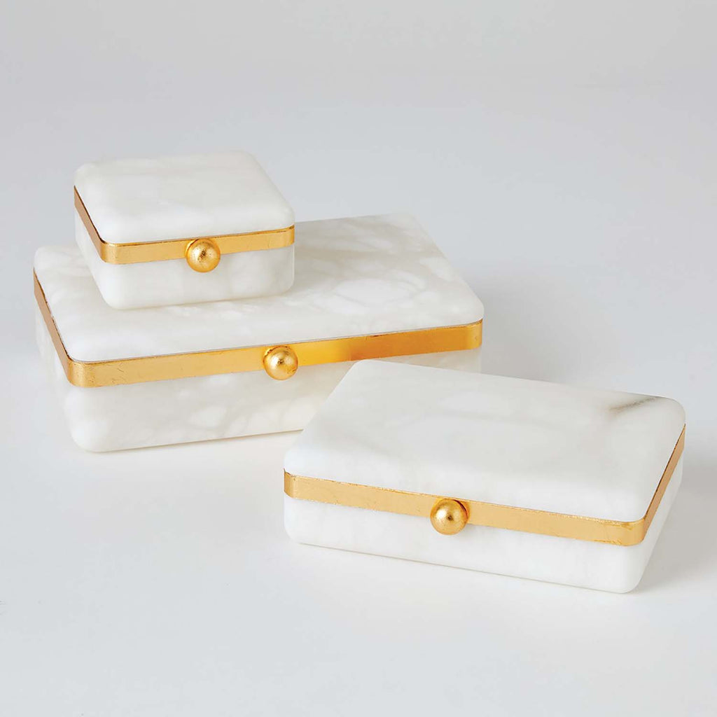 The Global Views Gold Band Swivel Boxes are made of handcrafted Italian alabaster with gold leaf accents. Three sizes available. As alabaster is a natural product, please be aware that there will always be variations in veining and color.