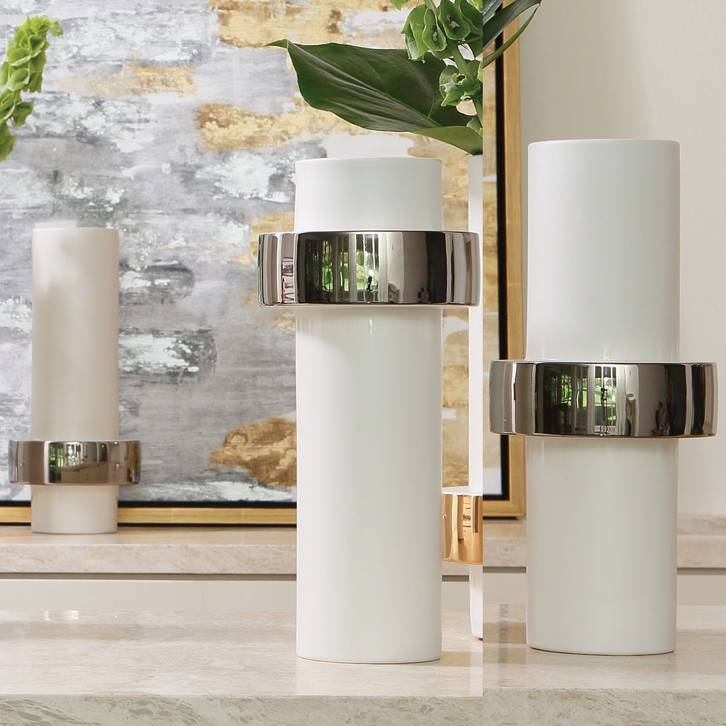 Simple meets luxe with the Global Views Ring vases. Beautiful creamy white Portuguese ceramic cylindrical vases get a glam makeover with strategically placed metallic gold or silver electroplated ring collars. Quite remarkable alone, but even better in a group! The "rings" have been placed at different levels so they may fit perfectly together, creating a stunning display.