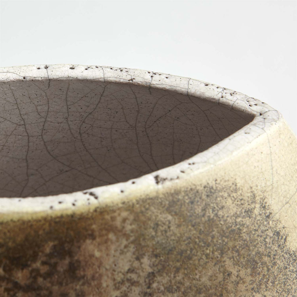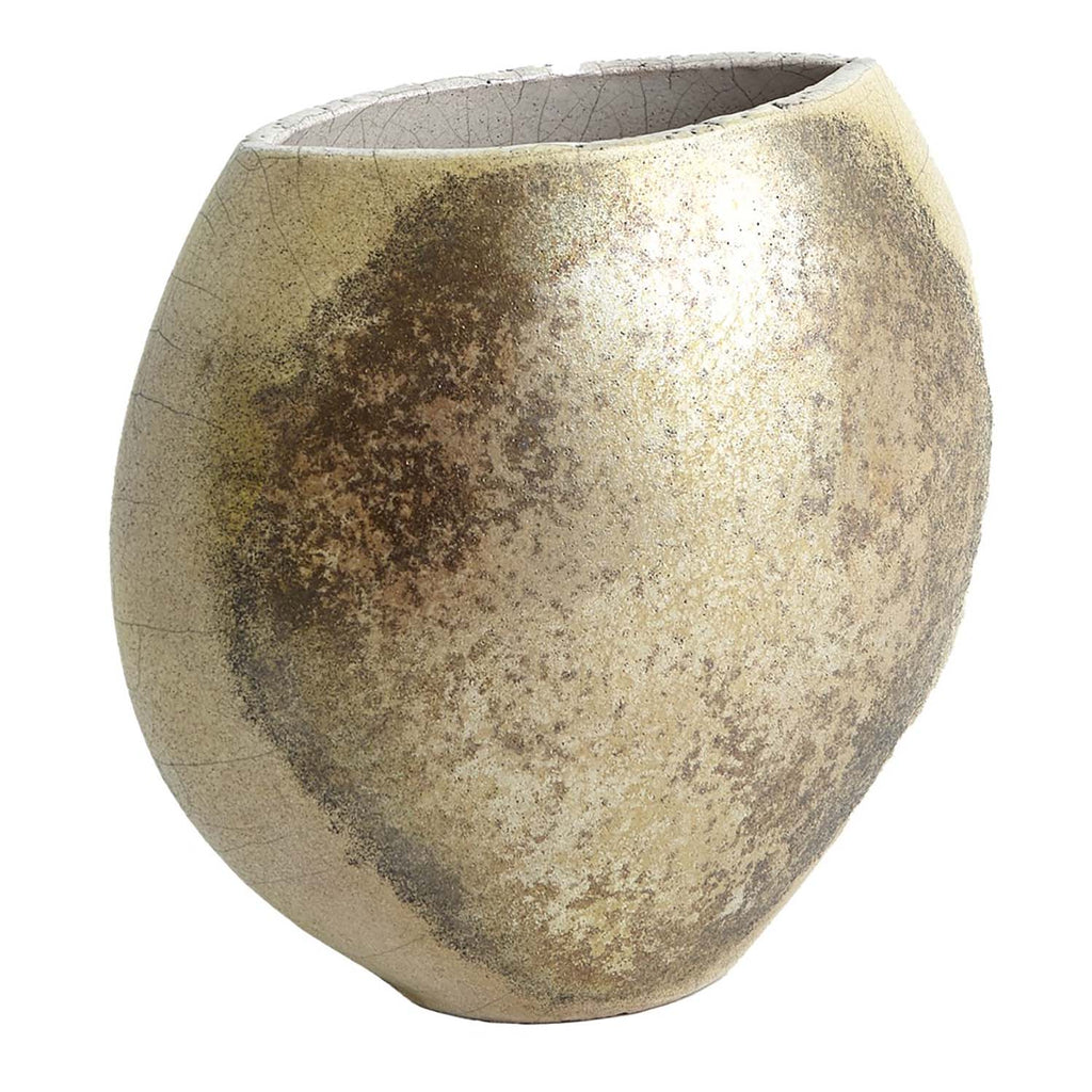 A highly reactive Raku-like glaze on ceramic. The intense reaction the glaze in the kiln creates random crystalline metallic areas on the golden finish. No two are alike.