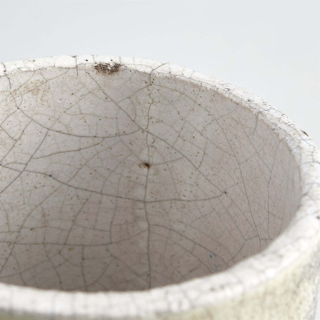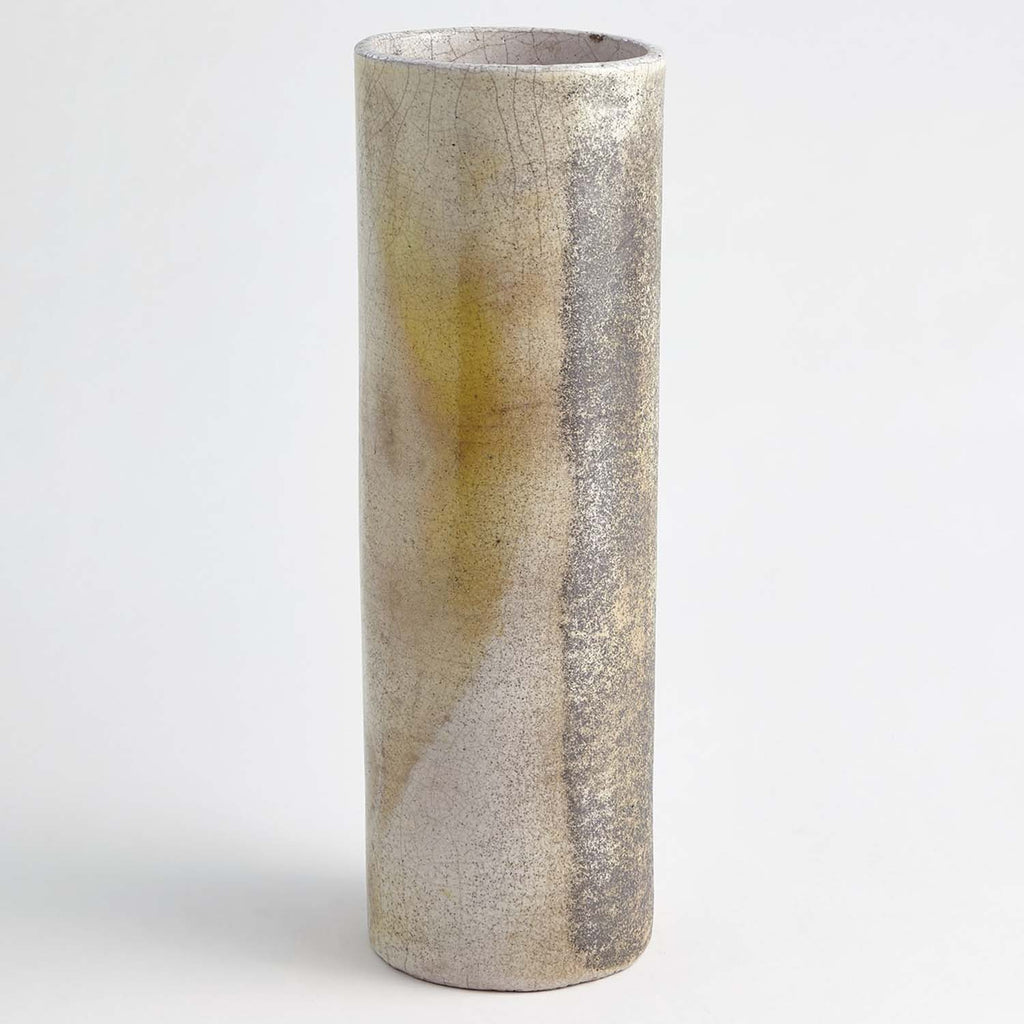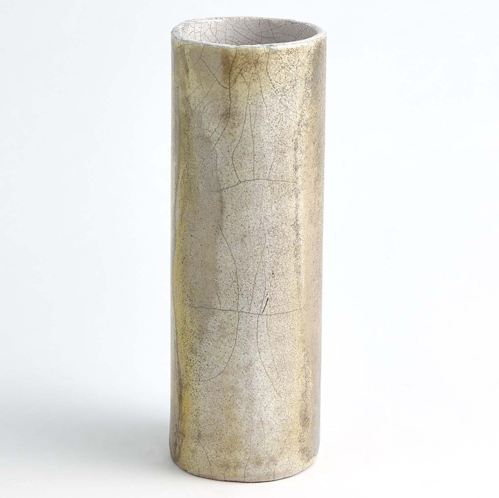 A highly reactive Raku-like glaze on ceramic. The intense reaction the glaze in the kiln creates random crystalline metallic areas on the golden finish. No two are alike.