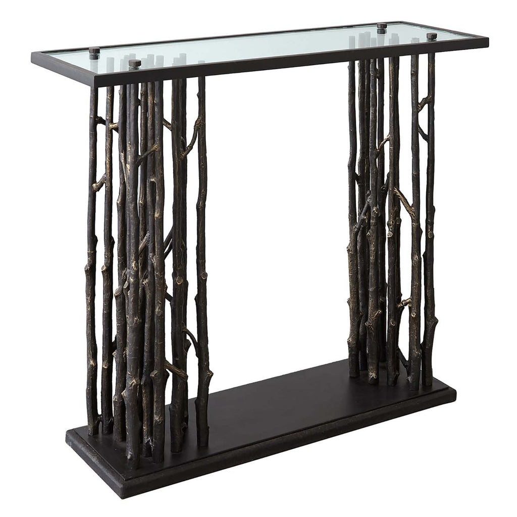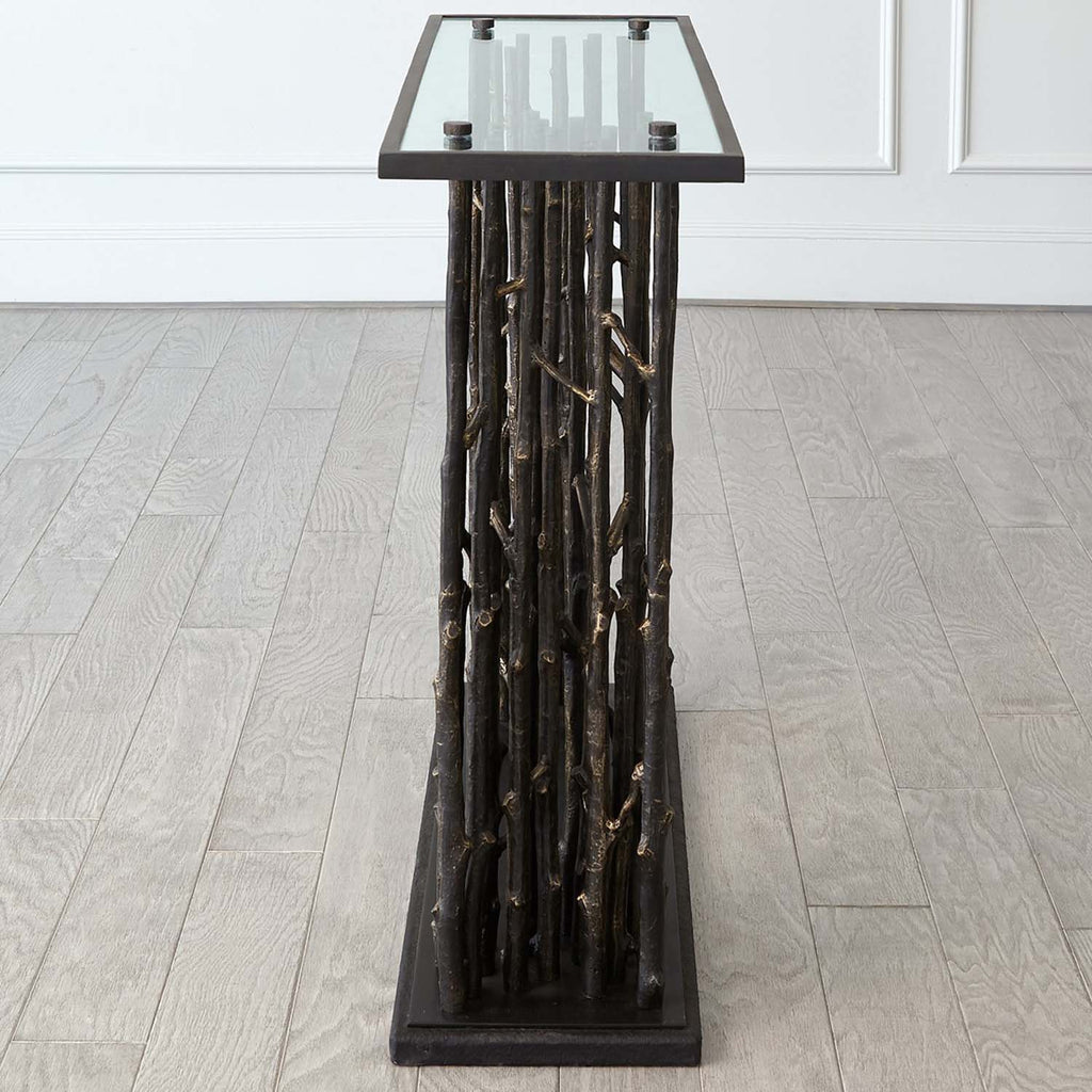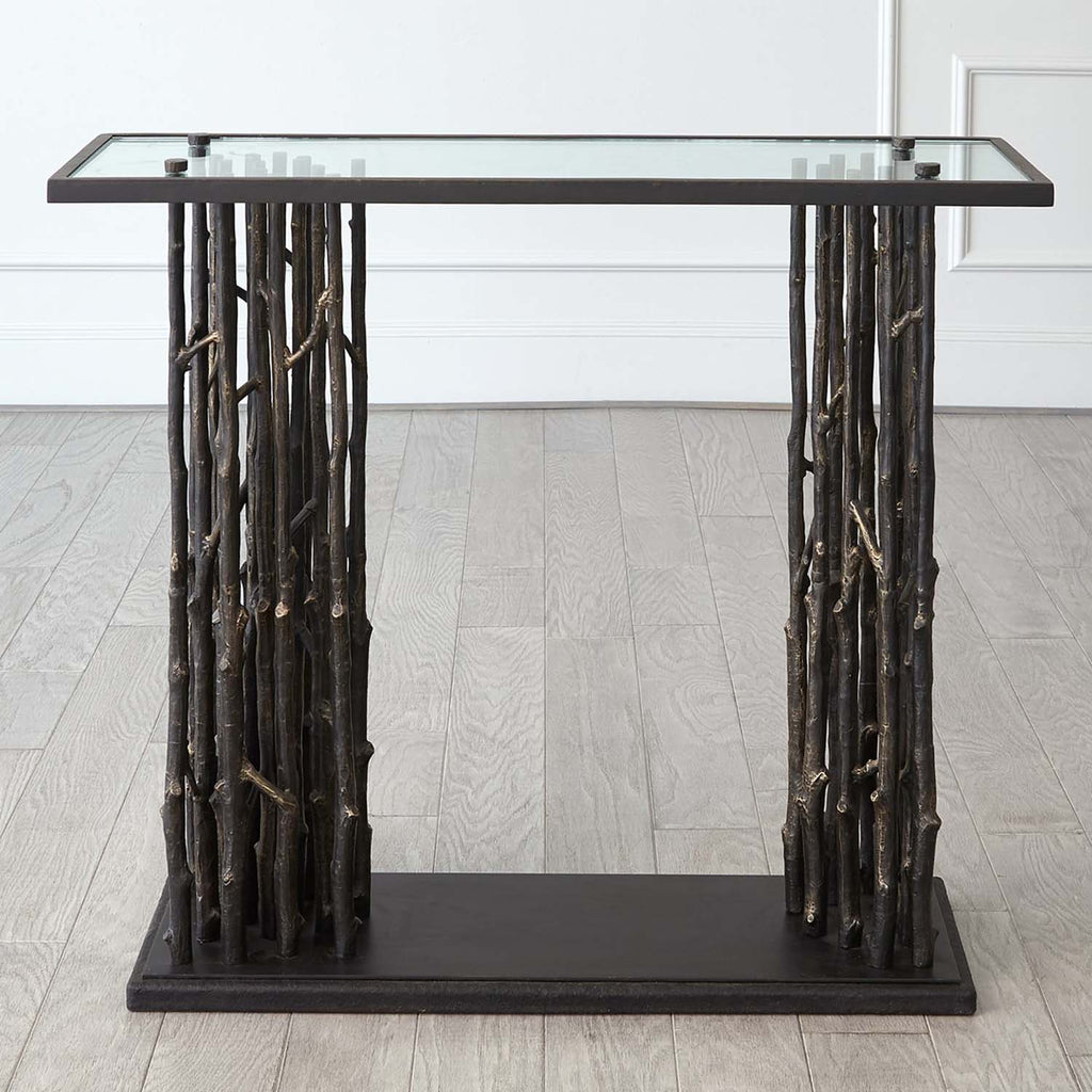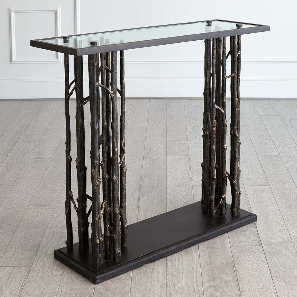 Nature-inspired cast iron with bronze finish with flamed granite shelves.