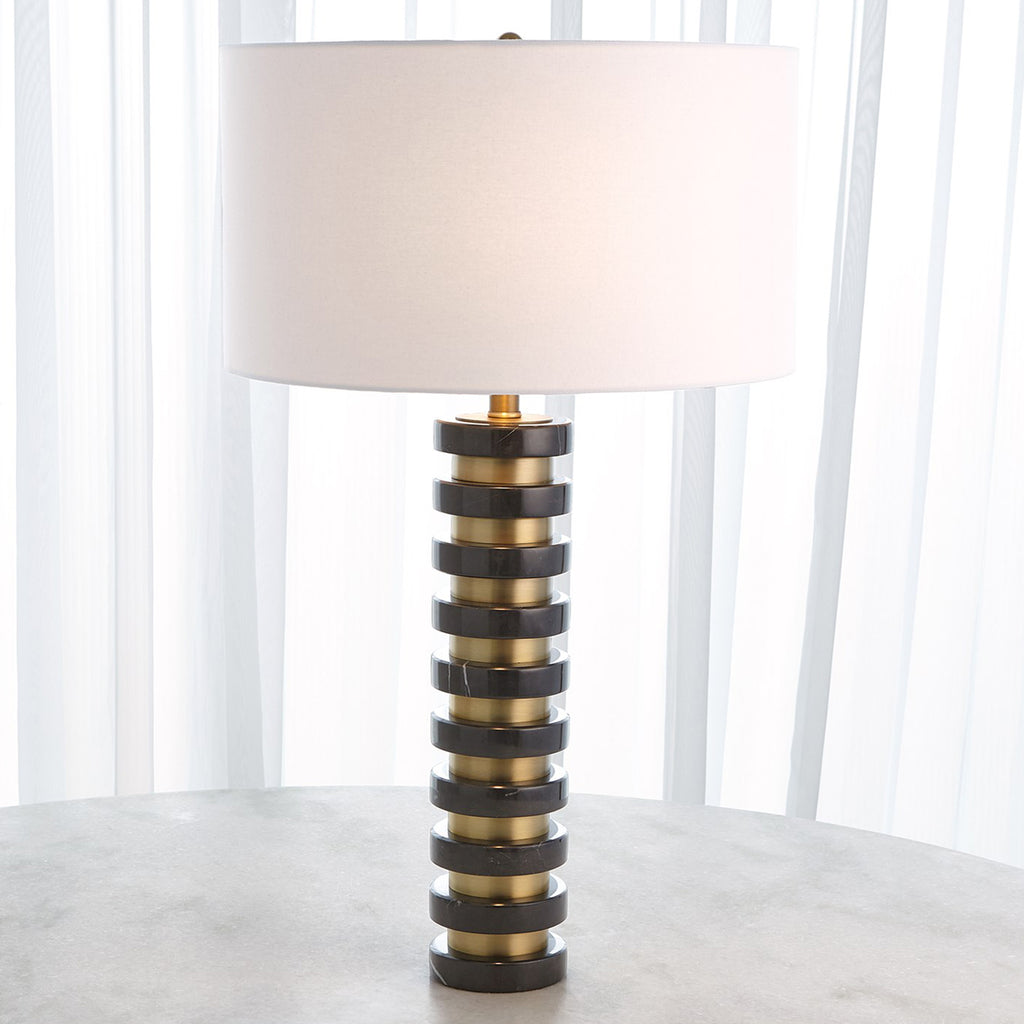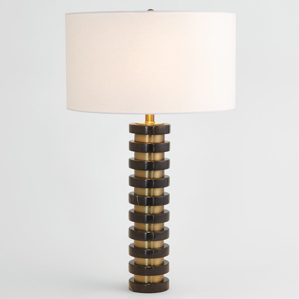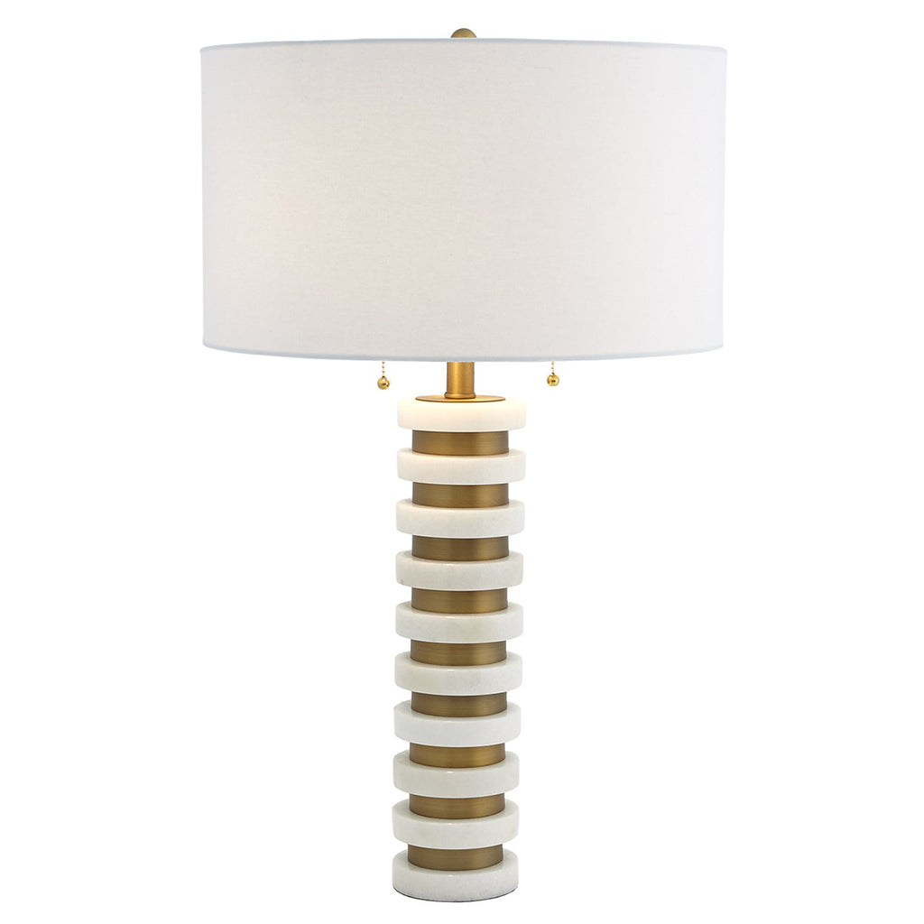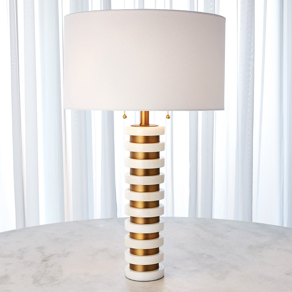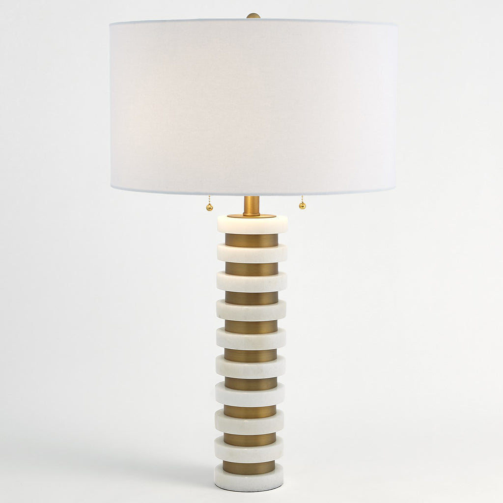 Stacked layers of marble separated by collars of brass plated steel. Holds two "A" bulbs with two pull chains and a brass finial. Hardback fabric shade. Made of naturally quarried marble, color and veining variations may occur.