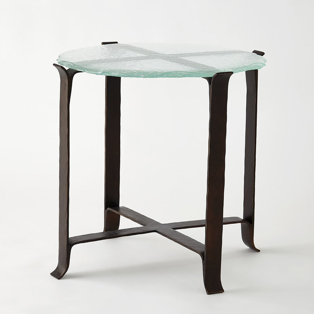 The Global Views Melting Glass Table Collection offers a unique way to add interest to your space. Italian glass has been "melted" in layers to create a truly unique tabletop. Placed atop an iron base finished in a warm bronze finish.