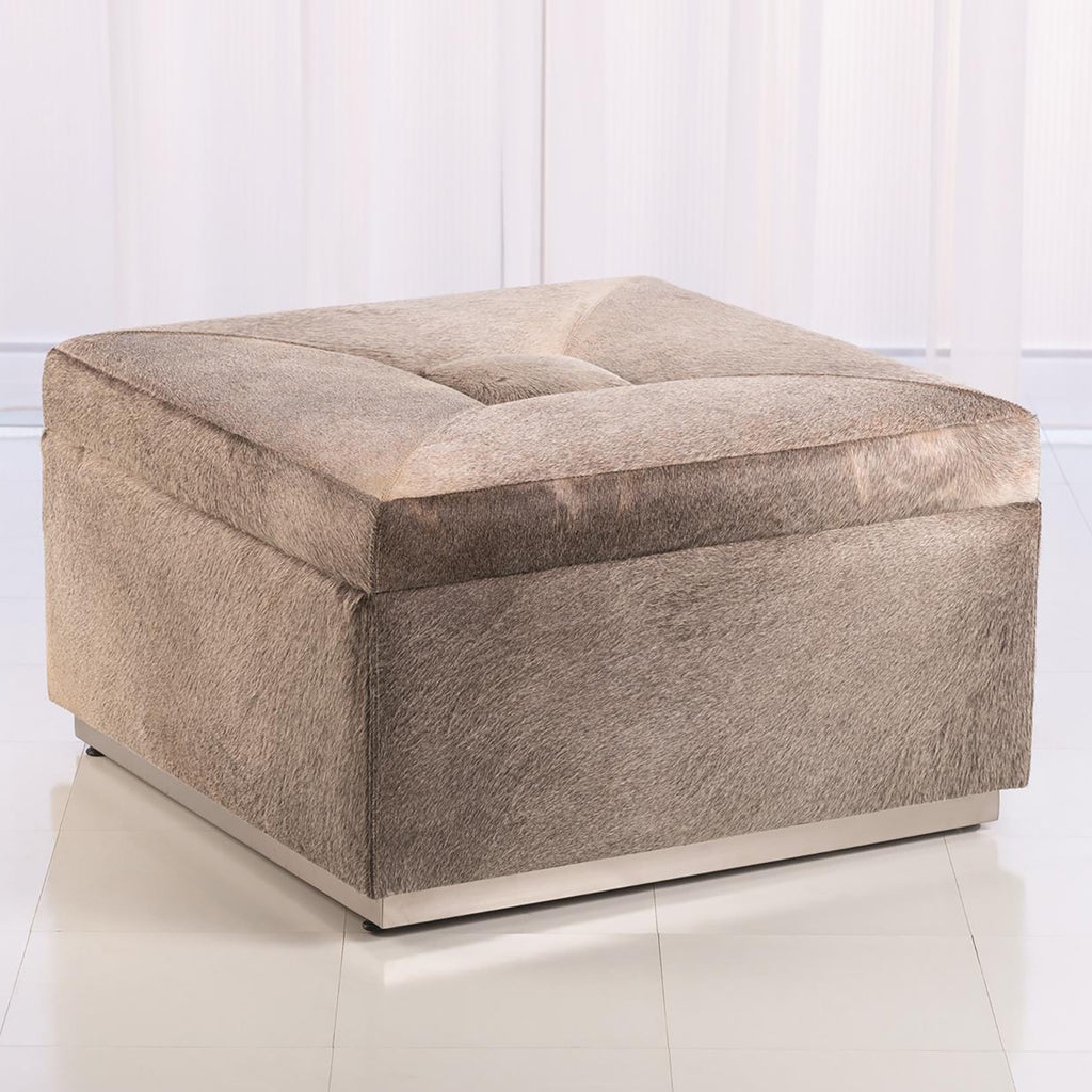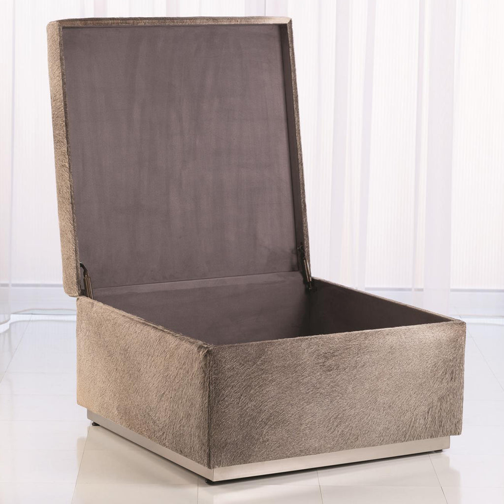 Generous in size and extremely functional with storage on the interior. Covered with gray hair-on-hide and large square bottom in the center of the top. Poly-suede covers the interior of the ottoman.