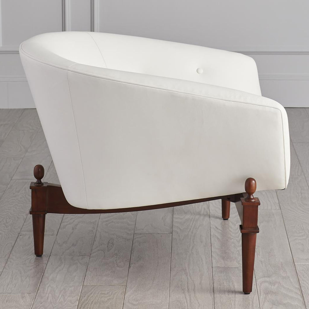 Reminiscent of the glamorous 1960's, the Global Views Mimi Chair marries modern design, exceptional craftsmanship, and very livable comfort. The barrel seat is covered in top grain cowhide leather, perched at a perfect pitch atop a three legged walnut-finished bracket base with finials. The Mimi Chair is stunning from every angle and begs to float in a room - offering changing silhouettes of surprising balance and proportion with every view. Classic, current, and timeless, the Mimi Chair harmonizes beautifully within the broad spectrum of high design.
