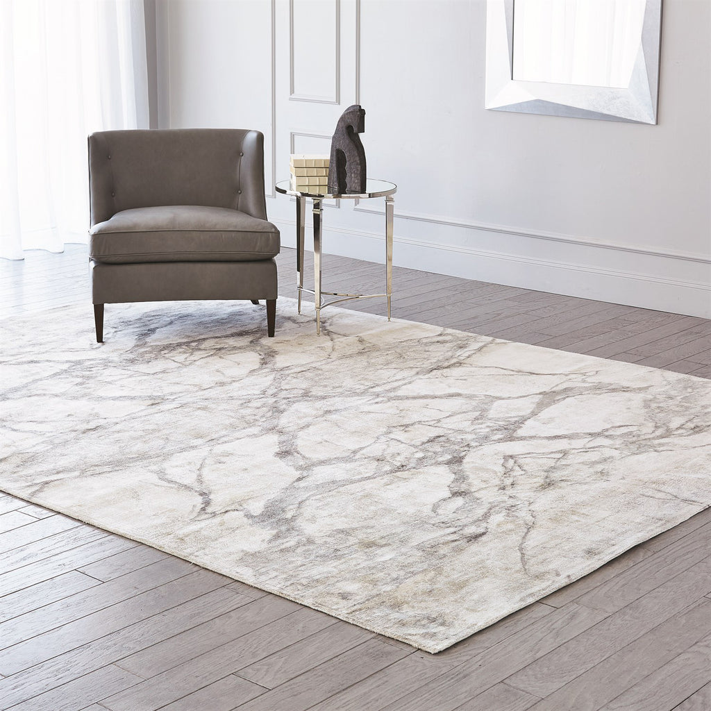 Screen printed bamboo silk rug with motif of mirror matched marble. Marbled rug print is cut at 90 degree angle and then formed together to create a full sheet, make these wonderful marble mirrored appearance joints. If the four quadrants are put together to form a rectangle, the results are stunning with the continuation of the pattern appearing in the center like a Rorschach test pattern. Very unique and 'now' in design and feel.