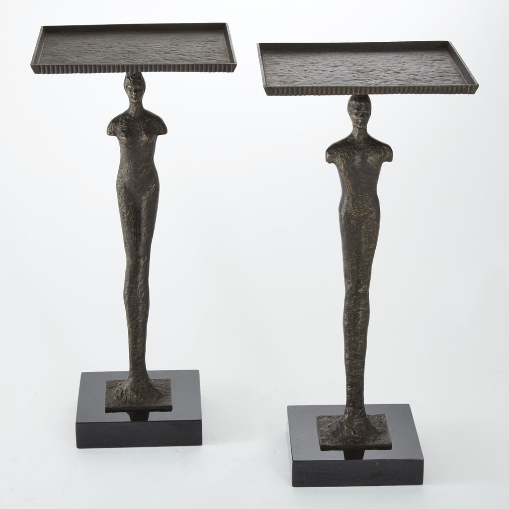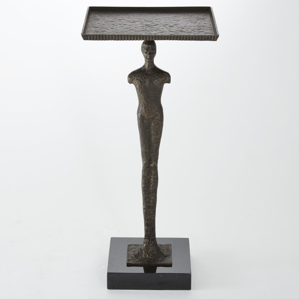 Our Global Views Modern Man Table captures humanity at its most basic. The iron figure of the man stands tall on a black granite base. A shallow lipped iron top sits on top of the figure giving a sleek surface.