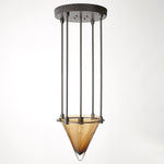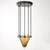 The Global Views Odette redefines the modern chandelier. Strong, clean metal elements delicately suspend a beautiful amber glass shade, fashioned after the sommerso style - made popular in the 1950's by Flavio Poli for Seguso. Distinct and simple, the Odette Chandelier is a statement piece either on its own or as a punctuating element when used in repetition, The canopy is circumscribed by a large-scale coin edge. The exacting metalwork is finished in a dark bronze.