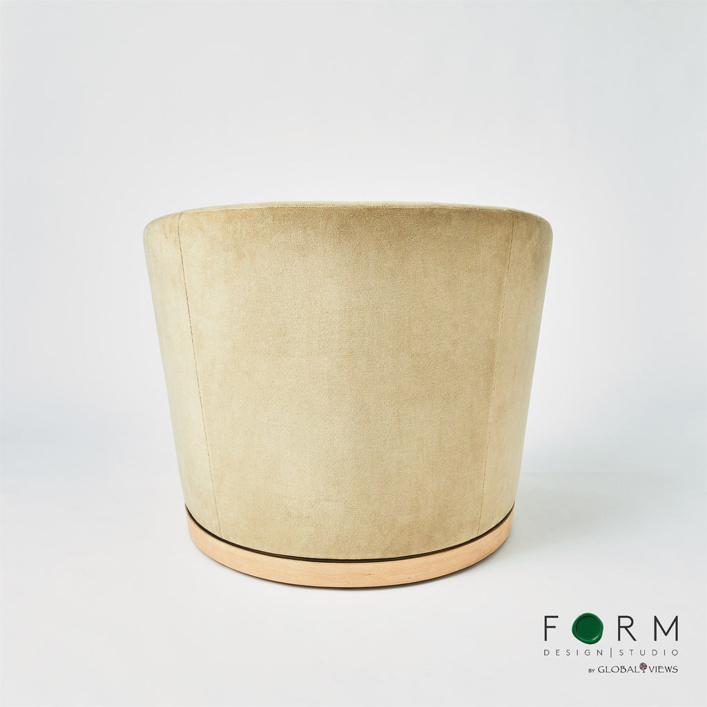 Elegant and sophisticated, the Global Views Ophelia Swivel Chair boasts graceful curves and soft lines. The chair rests on a white oak base, set apart from the expertly tailored 100% cotton velvet frame by an inset bronze reveal. The cantilevered seat offers a remarkable and deceptively comfortable perch from which to enjoy the moment.
