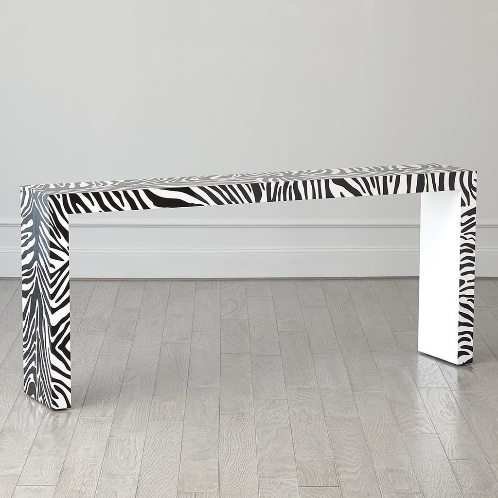 The Global Views Parson Table features a hand drawn zebra pattern by Creative Director George Sellers that's been stenciled and lacquered to create a graphic black and white statement!