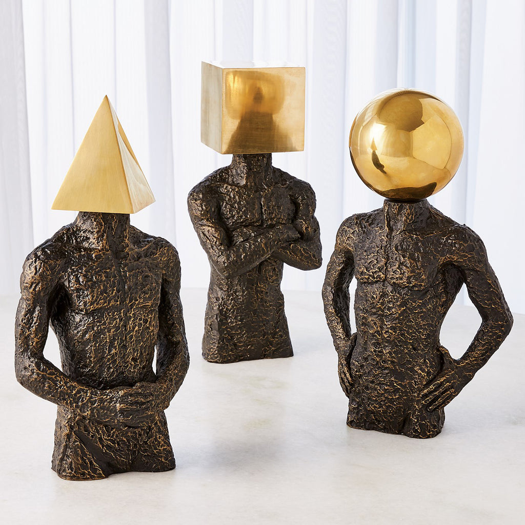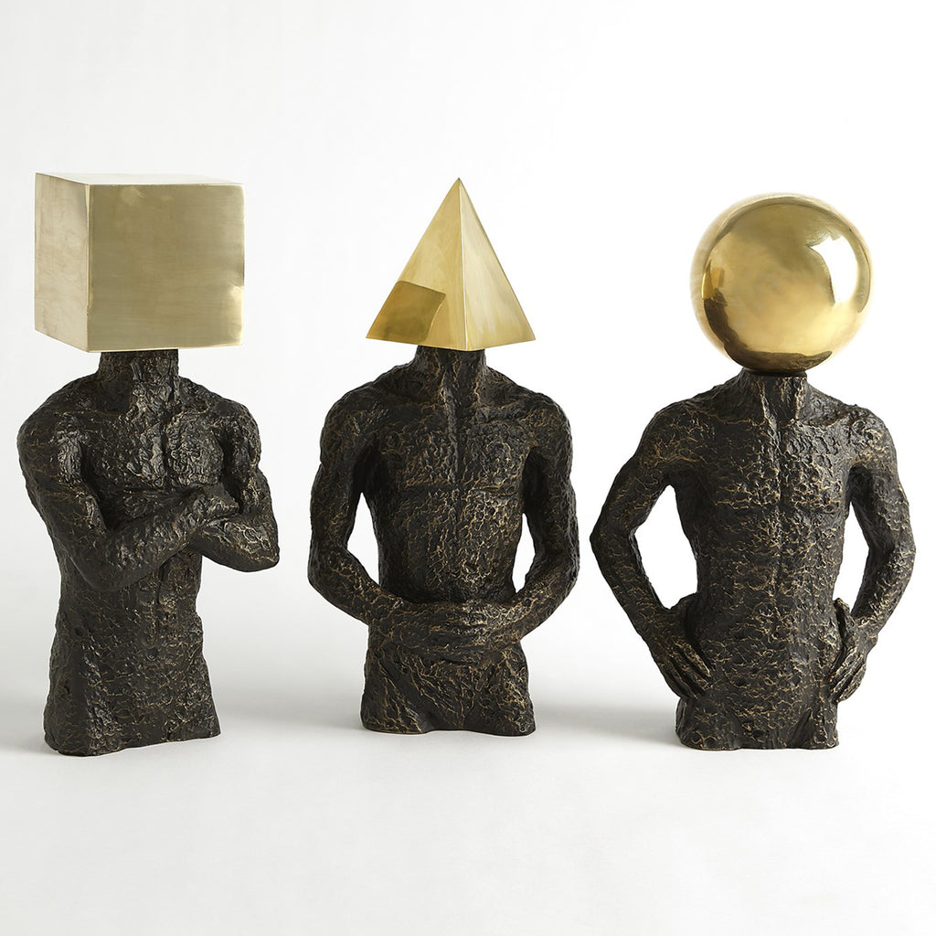 The Global Views Pyramid Hero is a whimsical sculpture created from cast iron with a brass geometric head. The exaggerated texture of the body with the juxtaposition to the smoothness of the head makes it the perfect conversation piece!