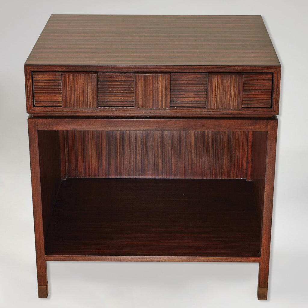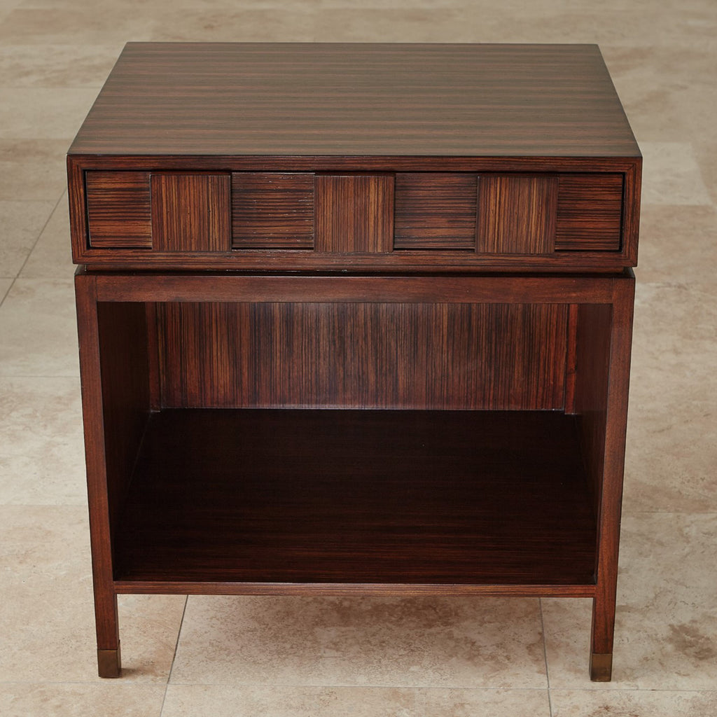 Practically perfect in every way, the Global Views Quad Block Bedside Table meets so many needs effortlessly. With its just-right size and spacious drawer detailed with four blocks and under mount self closing glides, the table provides ample storage. The large compartment under the drawer is roomy enough for your favorite things- from books to knick-knacks. Finished on four sides in a warm zebra wood veneer with square brass sabots on each leg.