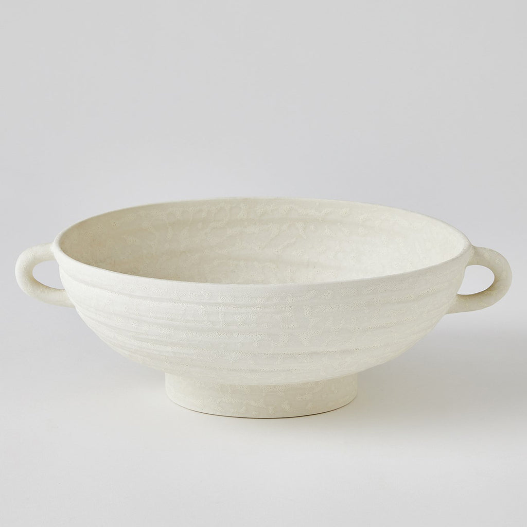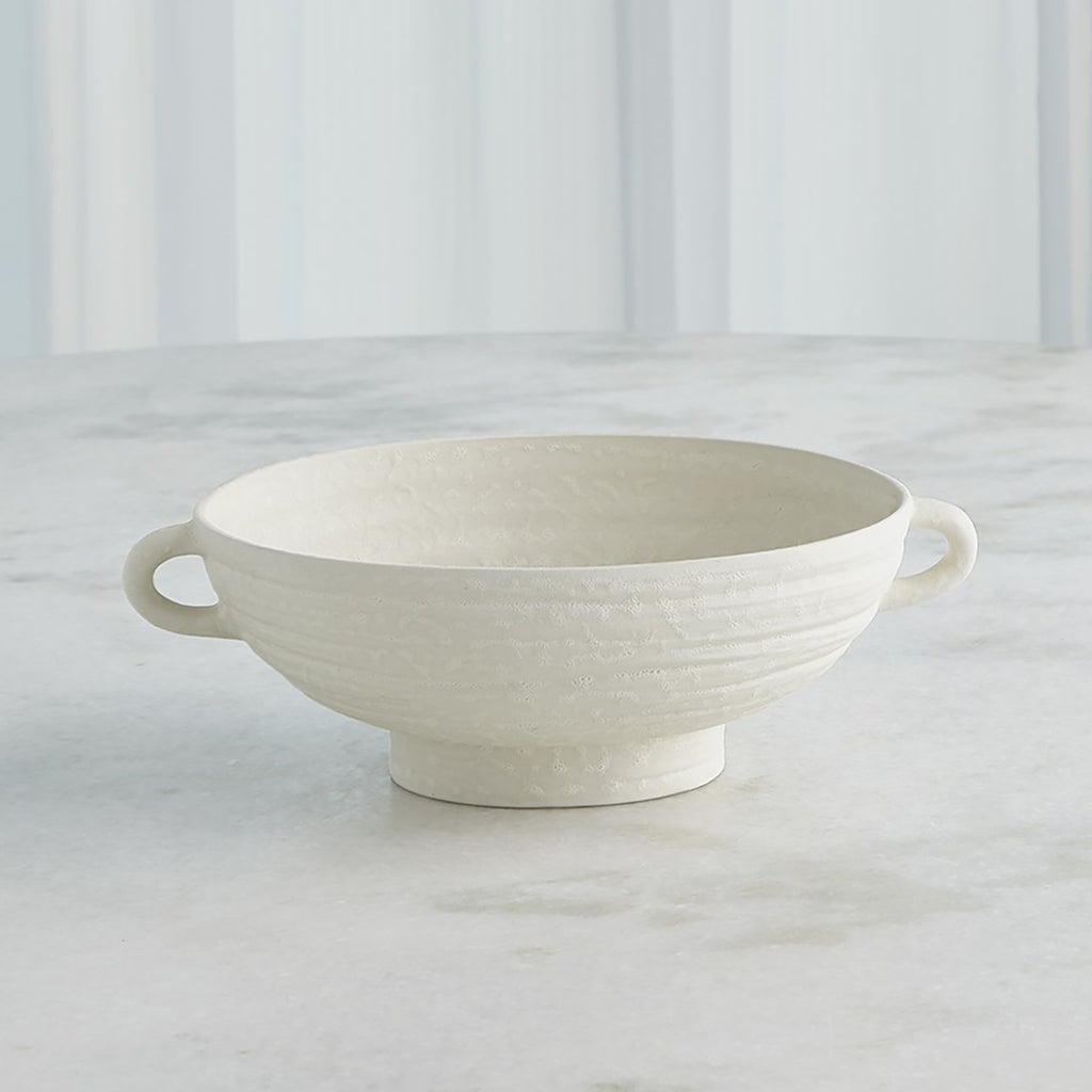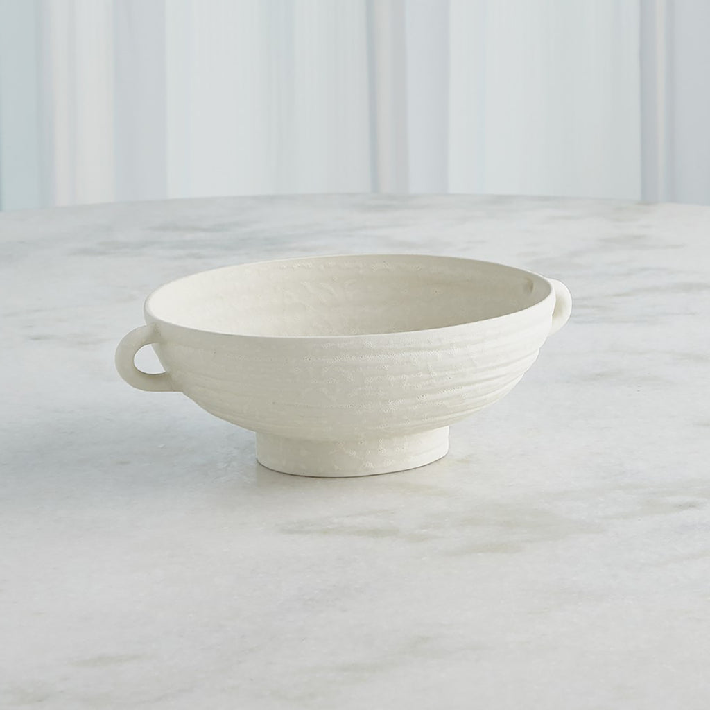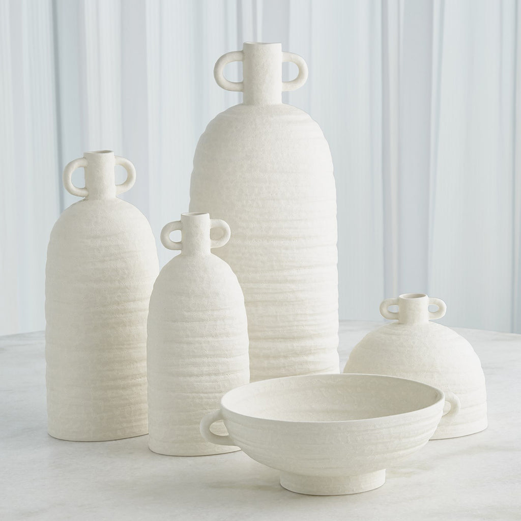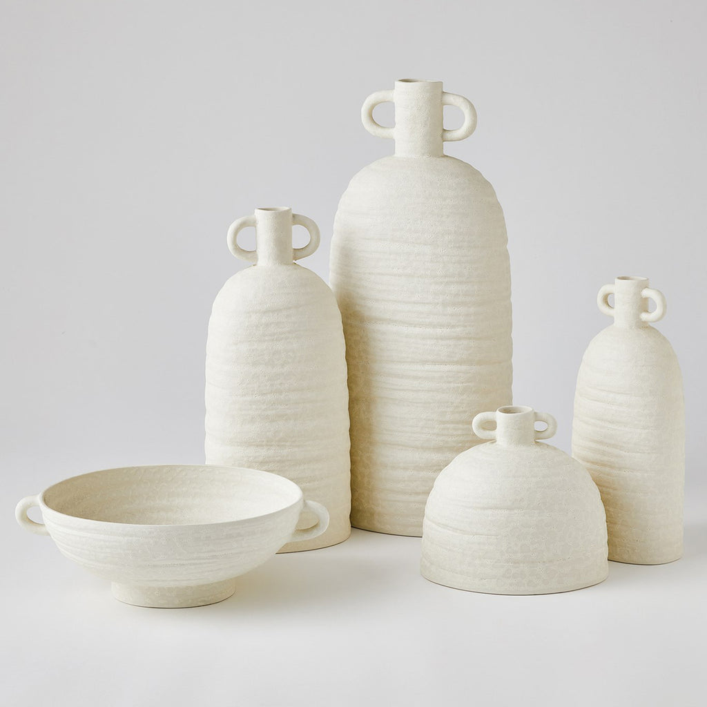 The Global Views Sahara Vases and Bowl are made of Portuguese ceramic with a textured white finish.