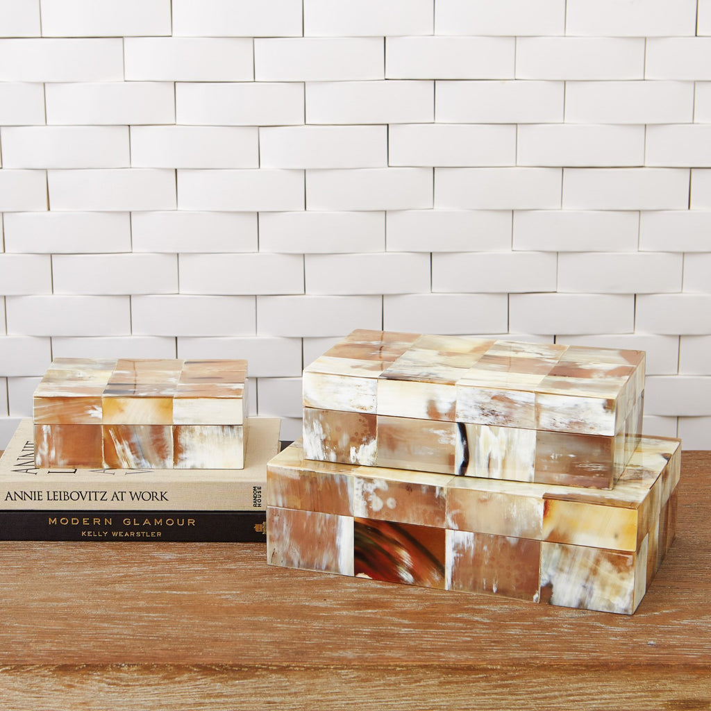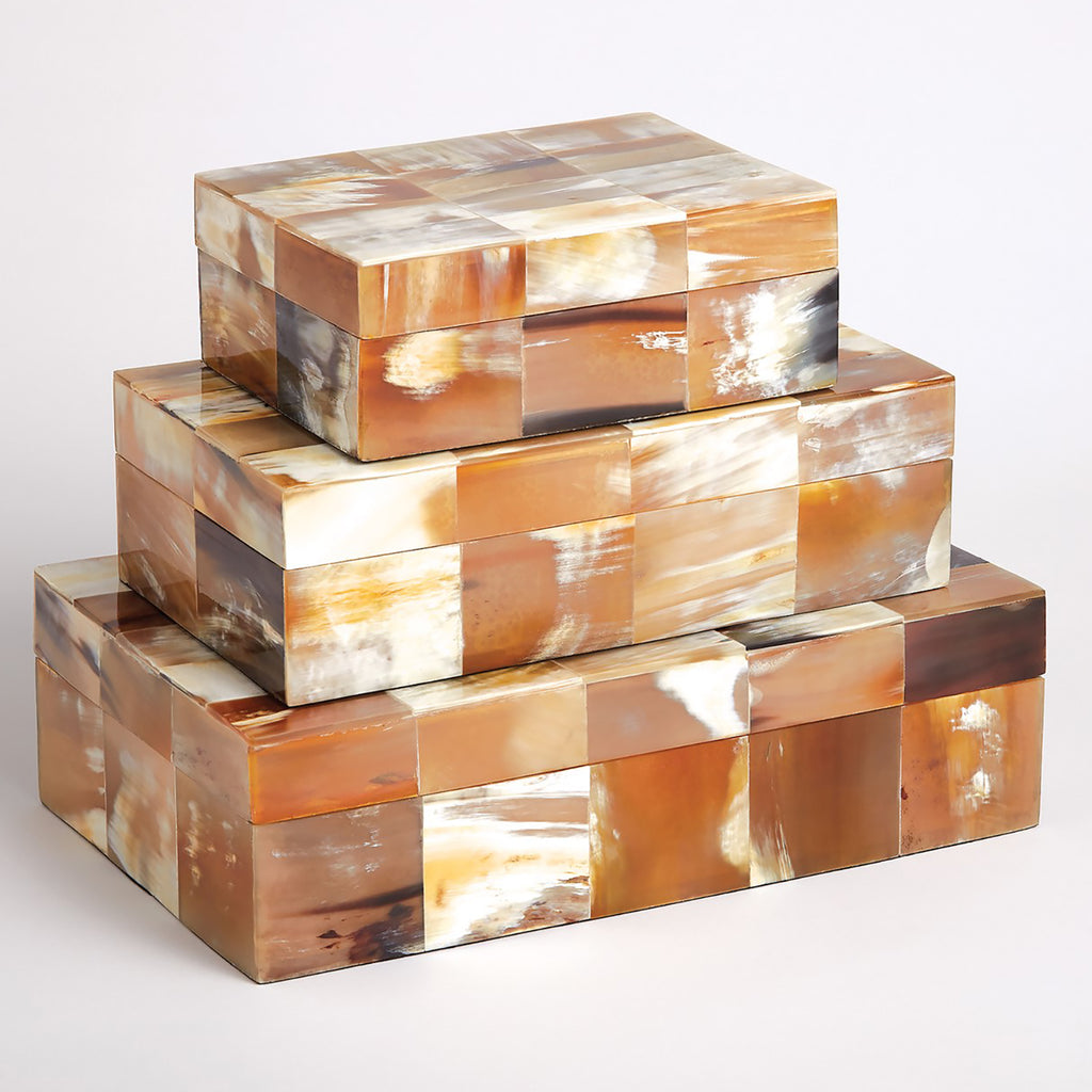Tiles of water buffalo horn cover the surface of the Sierra boxes. Each is individually hand crafted and highly polished. Detachable lid. Finished wooden interiors. Available in three sizes.