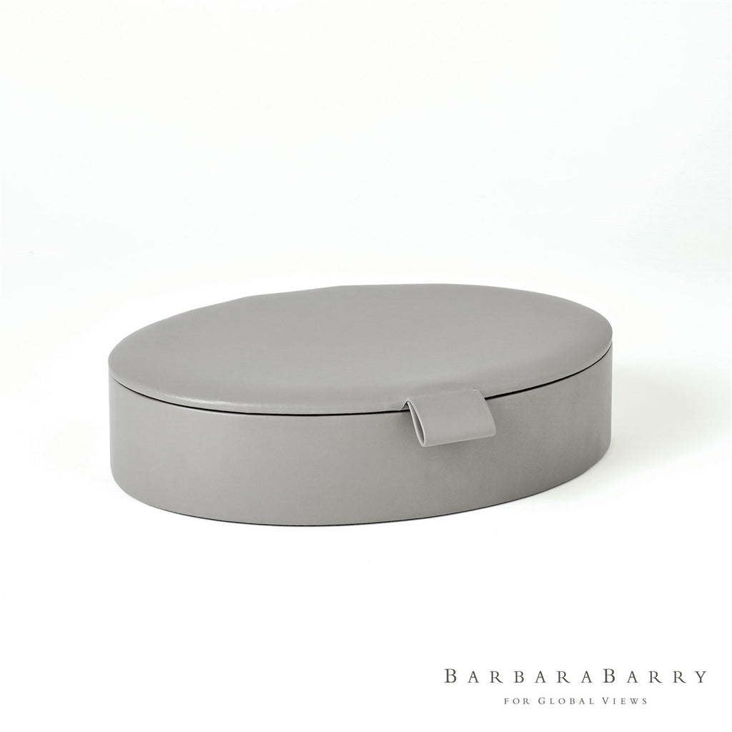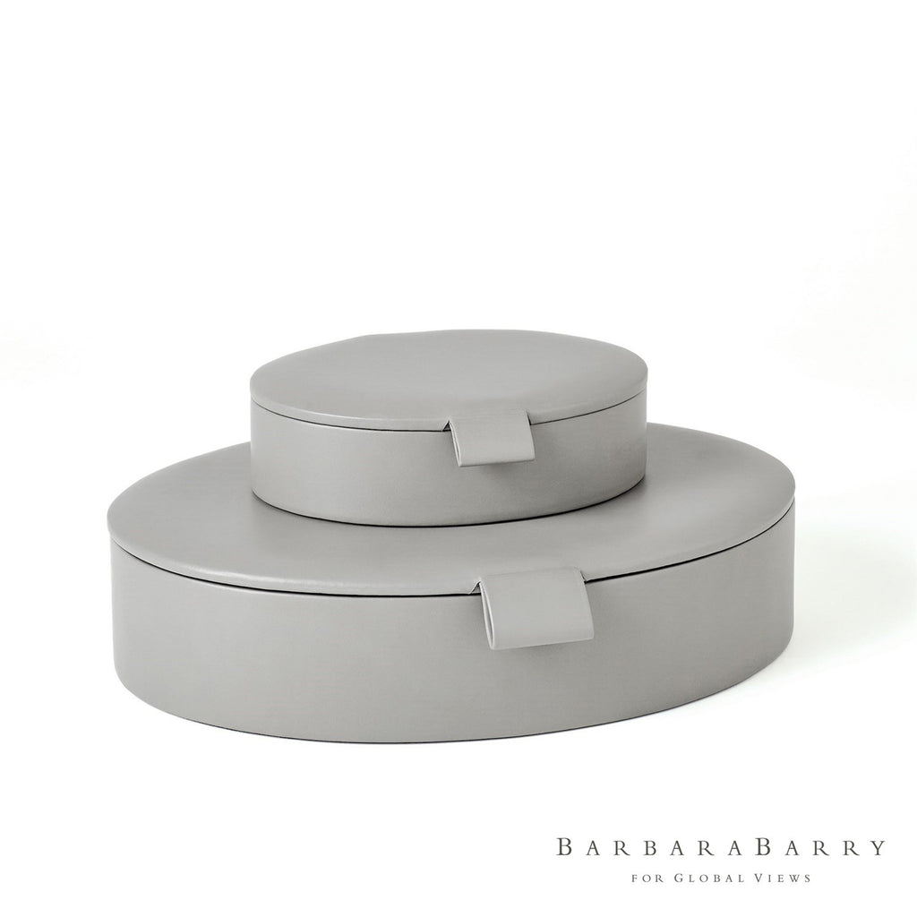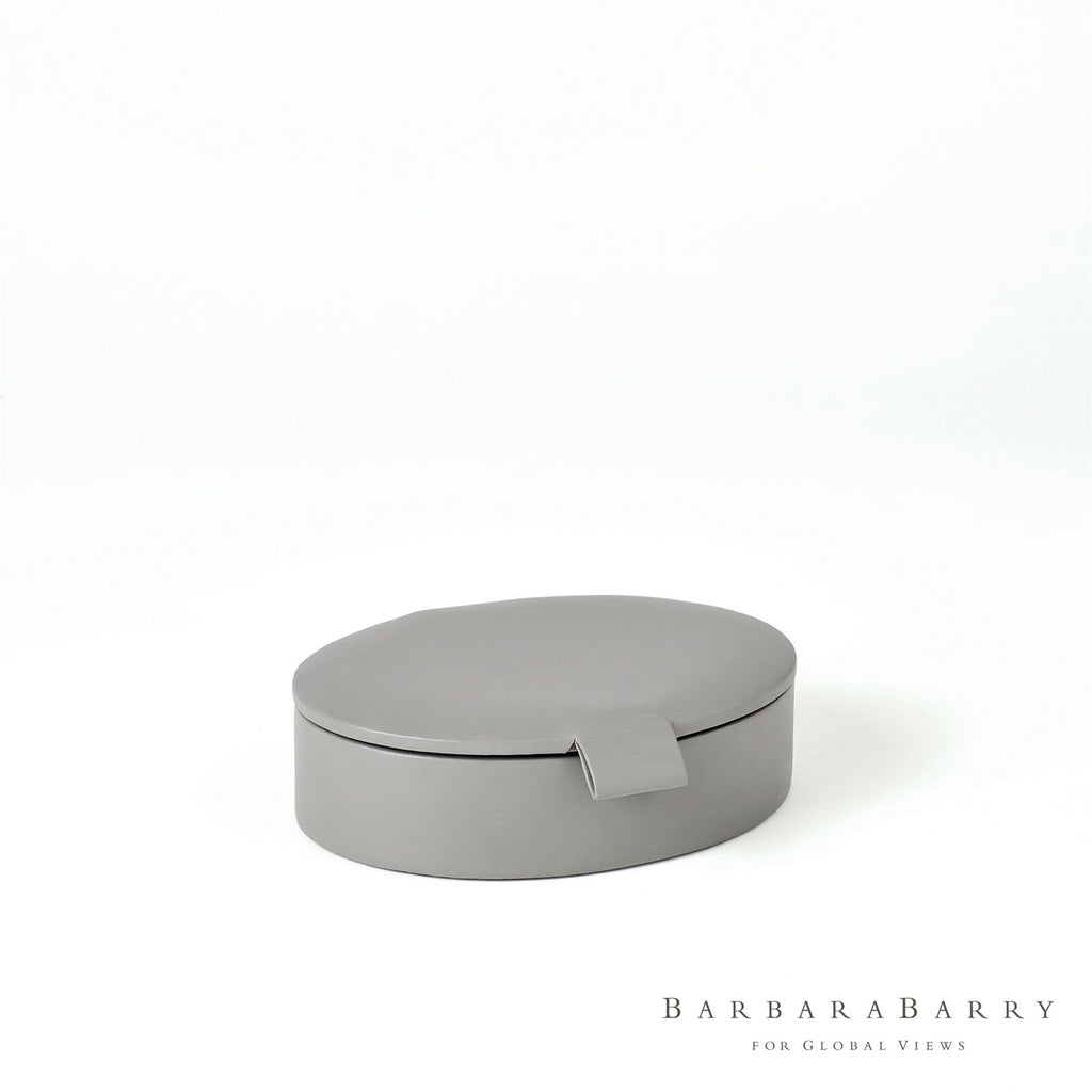 Bring a Barbara Barry classic to your home with the Global Views Signature Oval Leather Boxes. These boxes are offered in a soft ivory or rich gray with leather pulls and lined in suede.