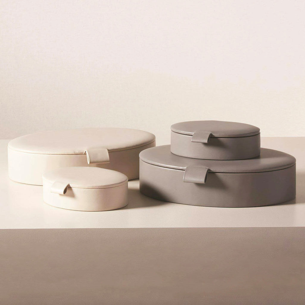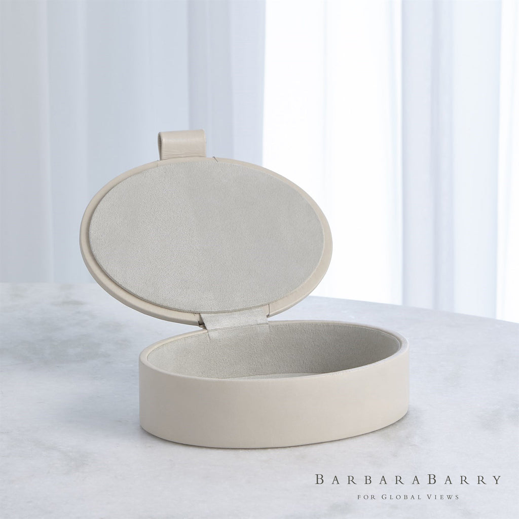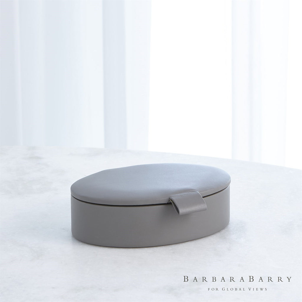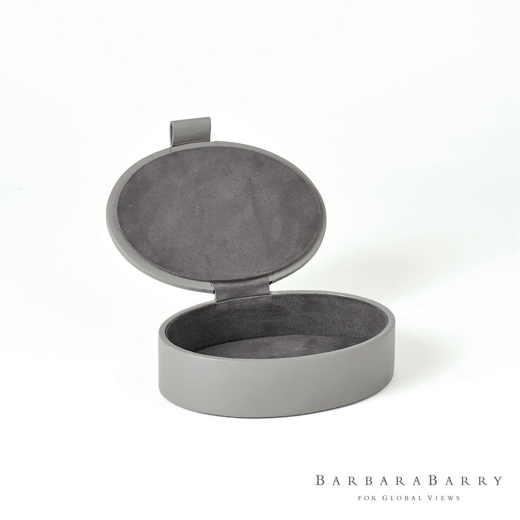 Bring a Barbara Barry classic to your home with the Global Views Signature Oval Leather Boxes. These boxes are offered in a soft ivory or rich gray with leather pulls and lined in suede.
