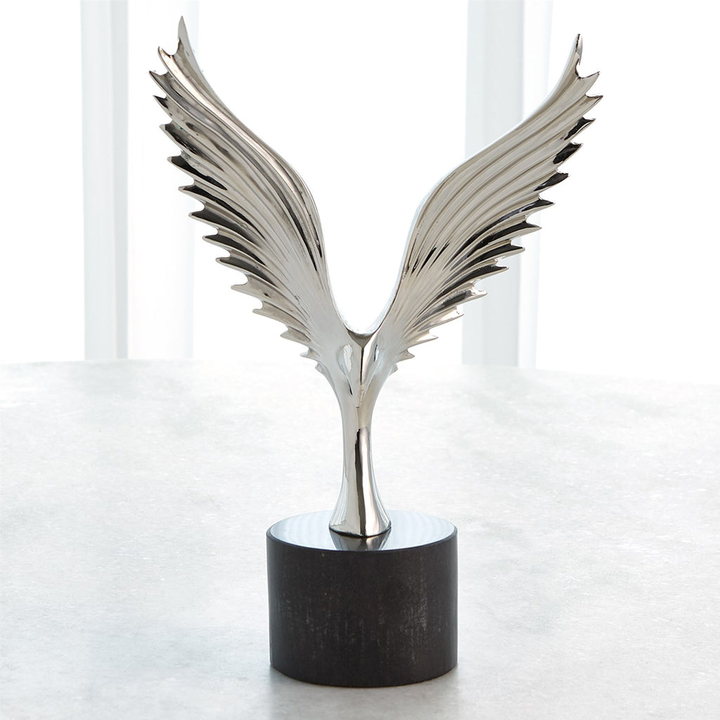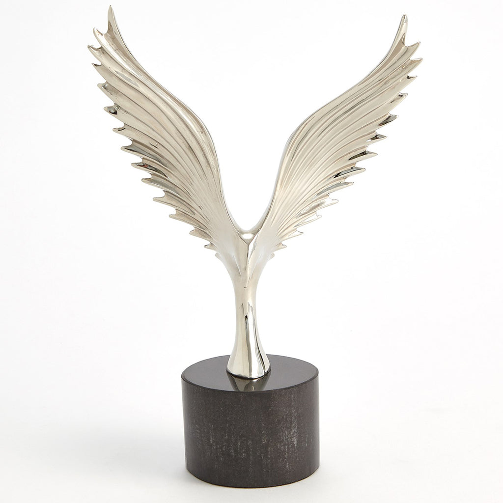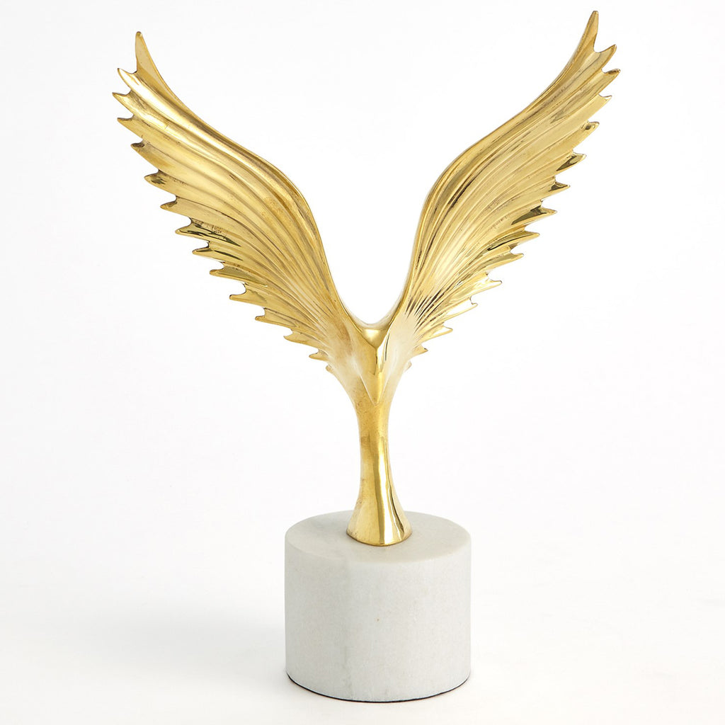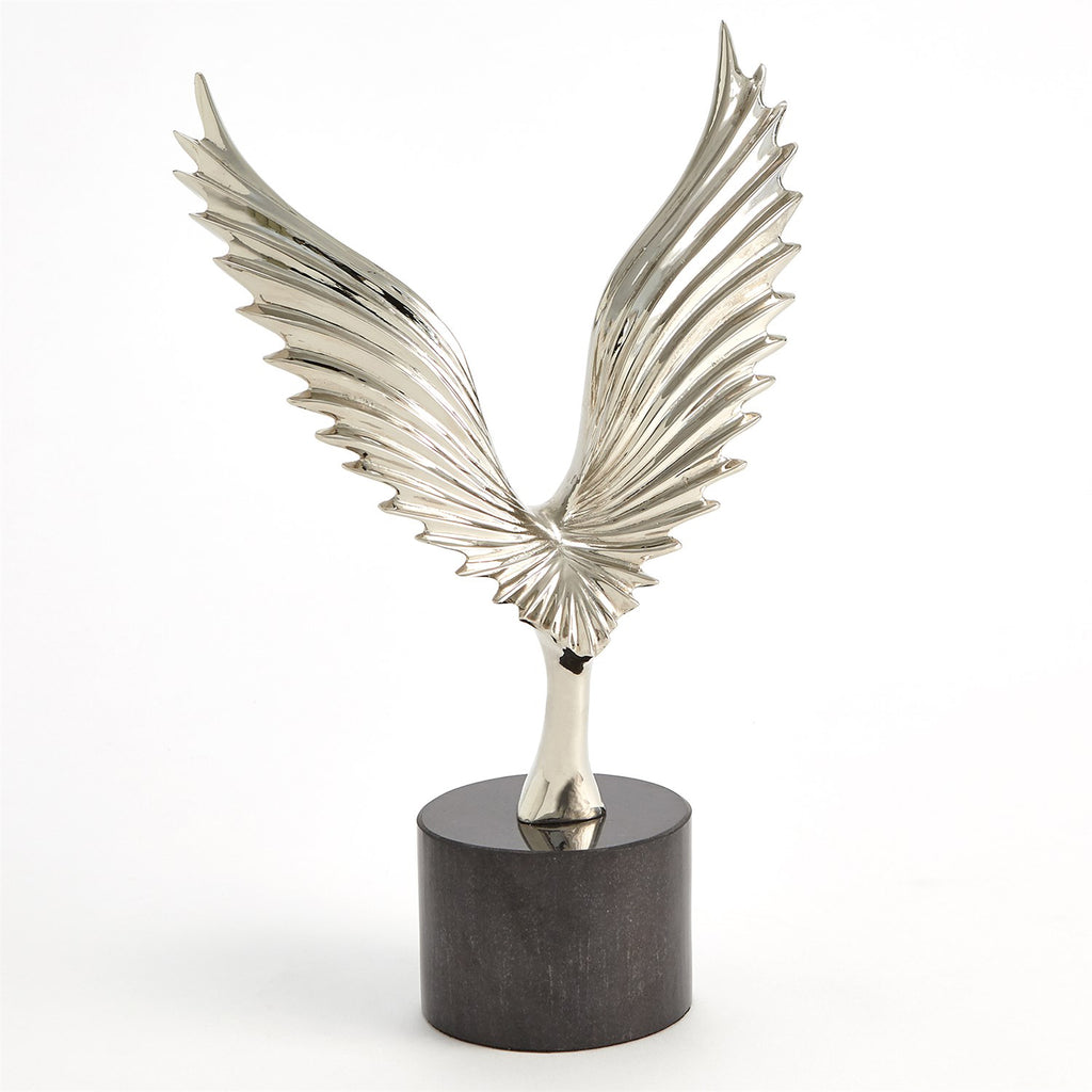 The Global Views Soaring Sculptures are offered in polished brass with a white marble base and nickel-plated brass with a black marble base.