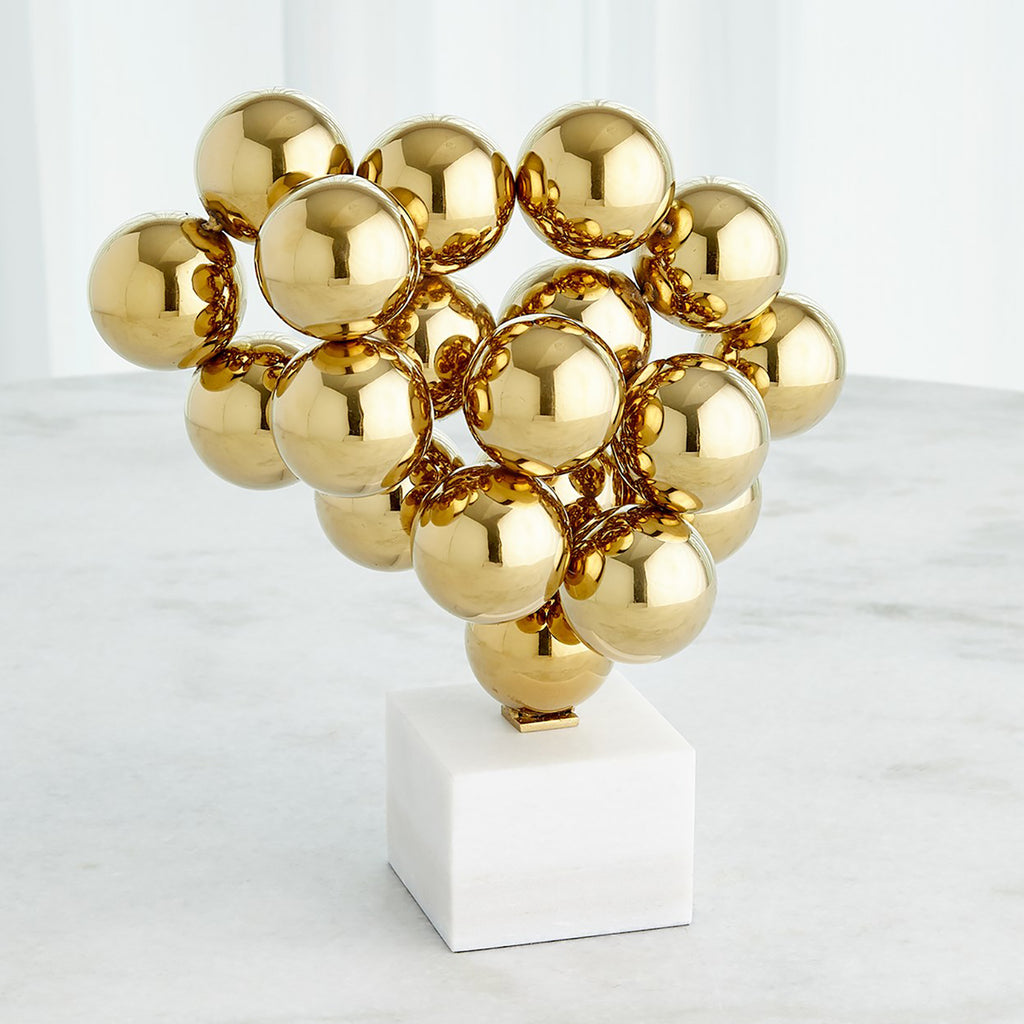 An abstract sculpture of stacked brass finished spheres on a white marble base.