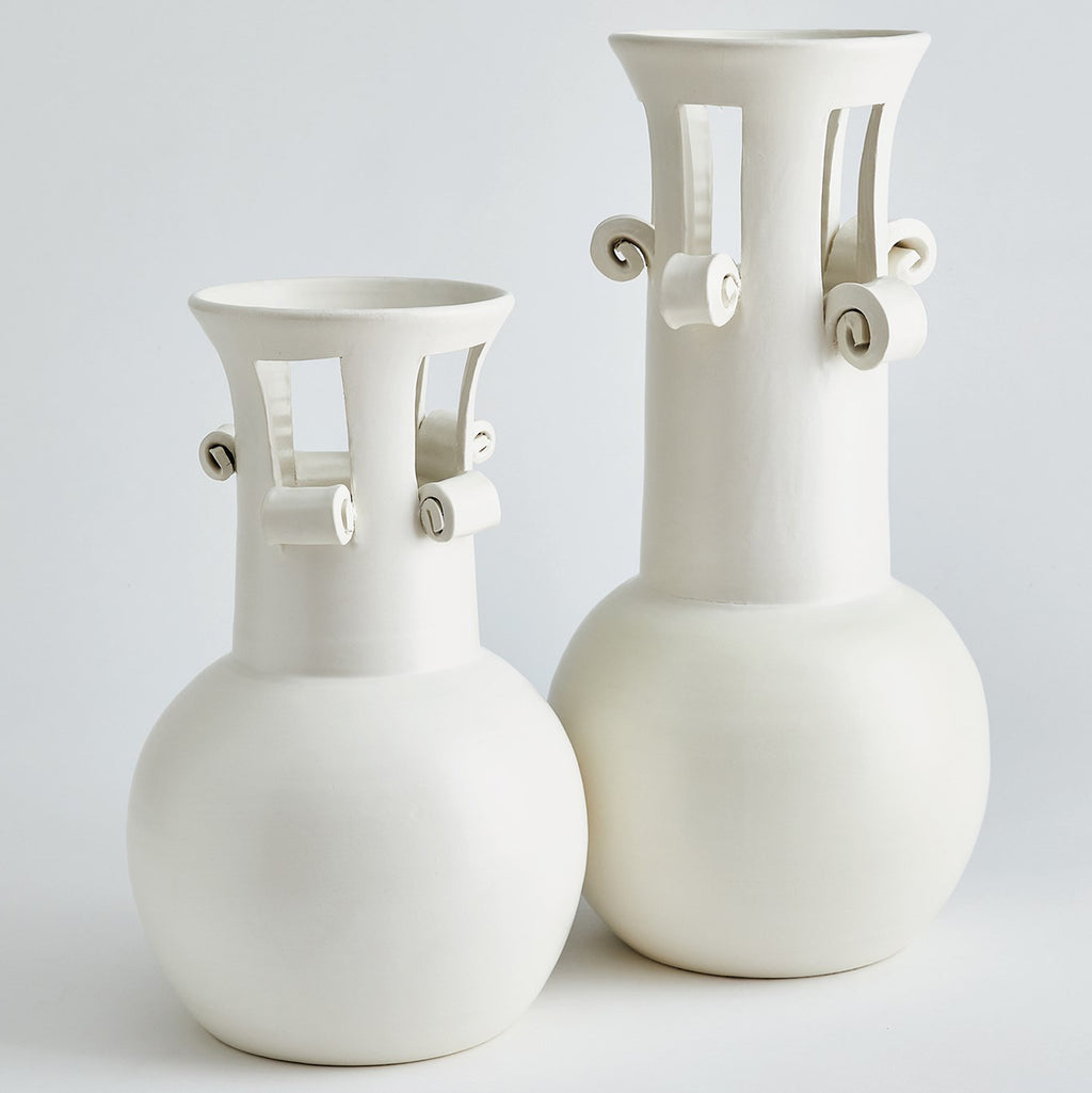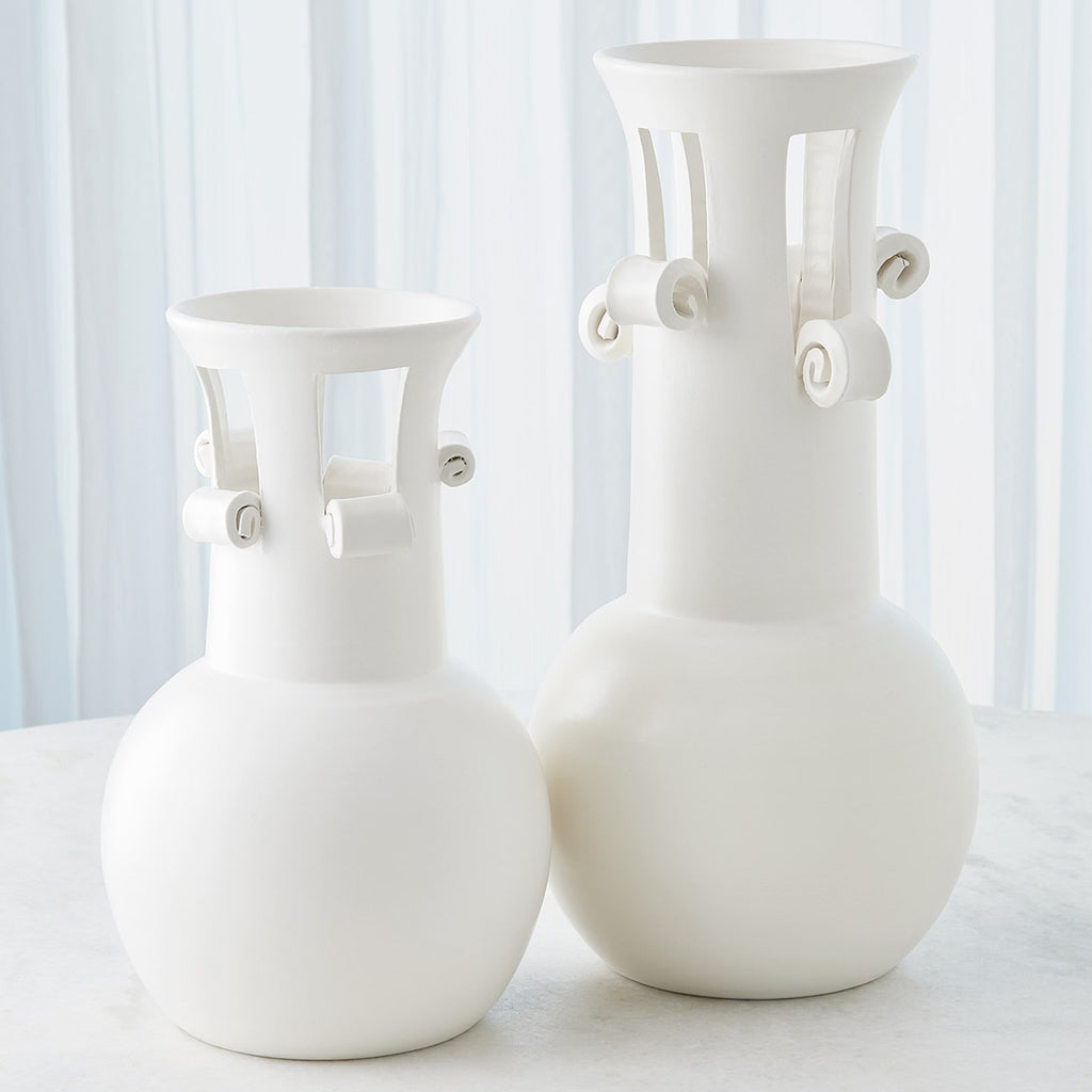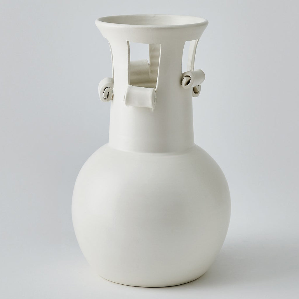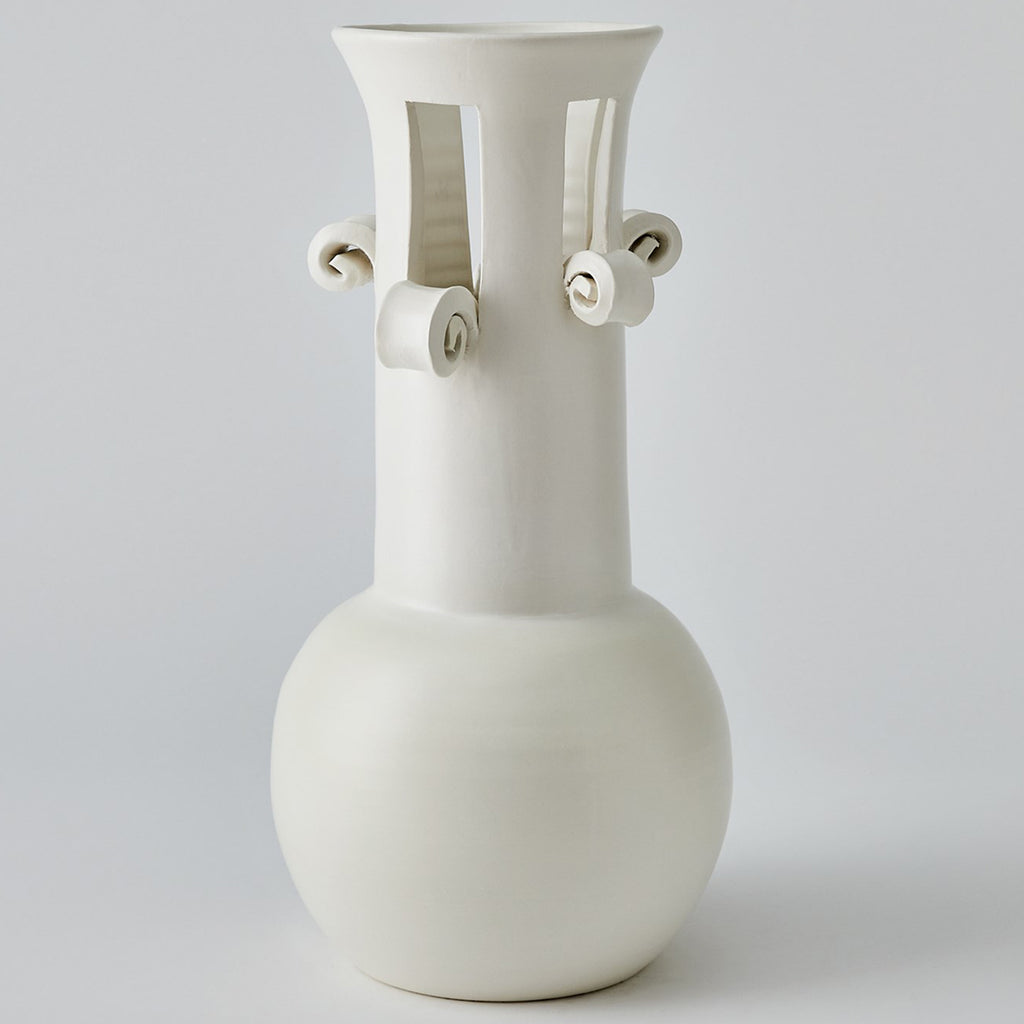 The Spiral Handle Vases are an elegant expression of Italian ceramic artistry. Crafted using slip-molding, each vase is adorned with hand-cut, rolled spiral handles that add texture and movement to its refined silhouette. Finished in a smooth matte white, these vases offer a minimalist yet striking presence, perfect for elevating any sophisticated space.