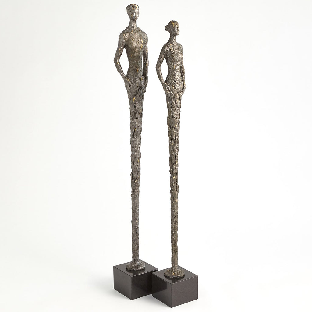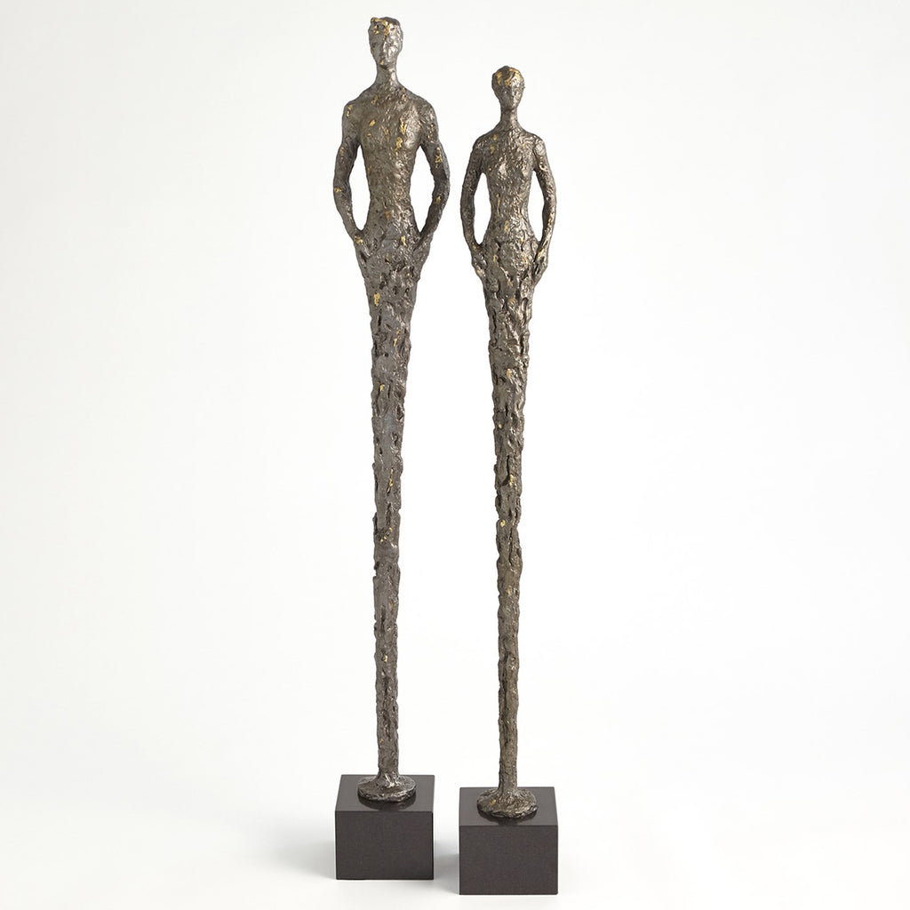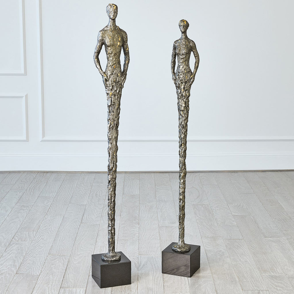 The Global Views Stretch Man and Woman are made of sand casted iron with an antique natural iron finish on a black marble base.