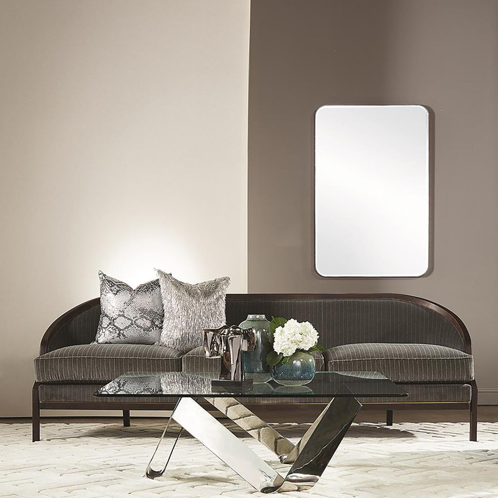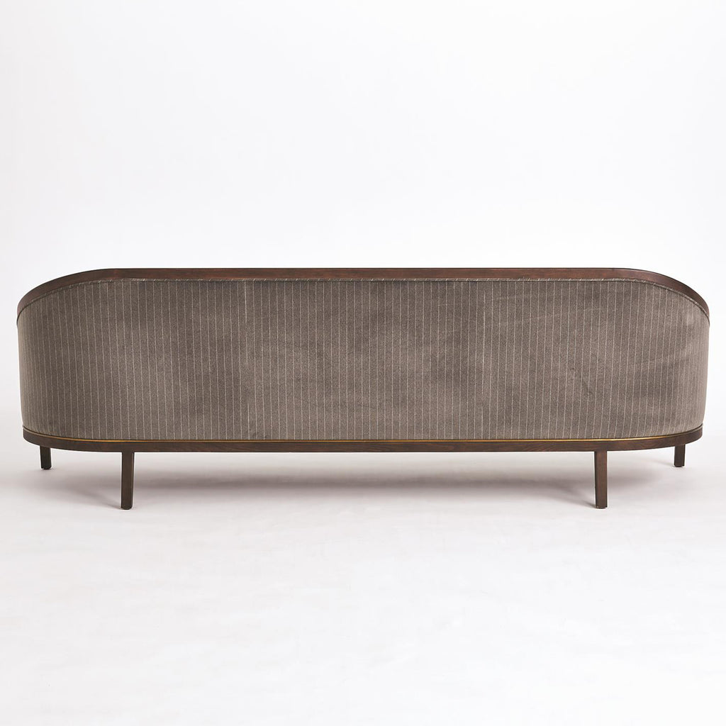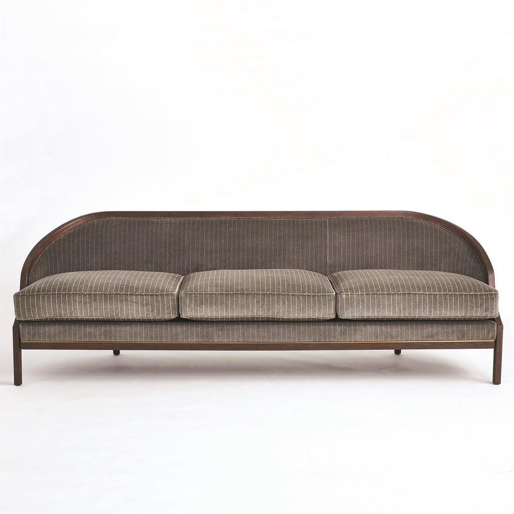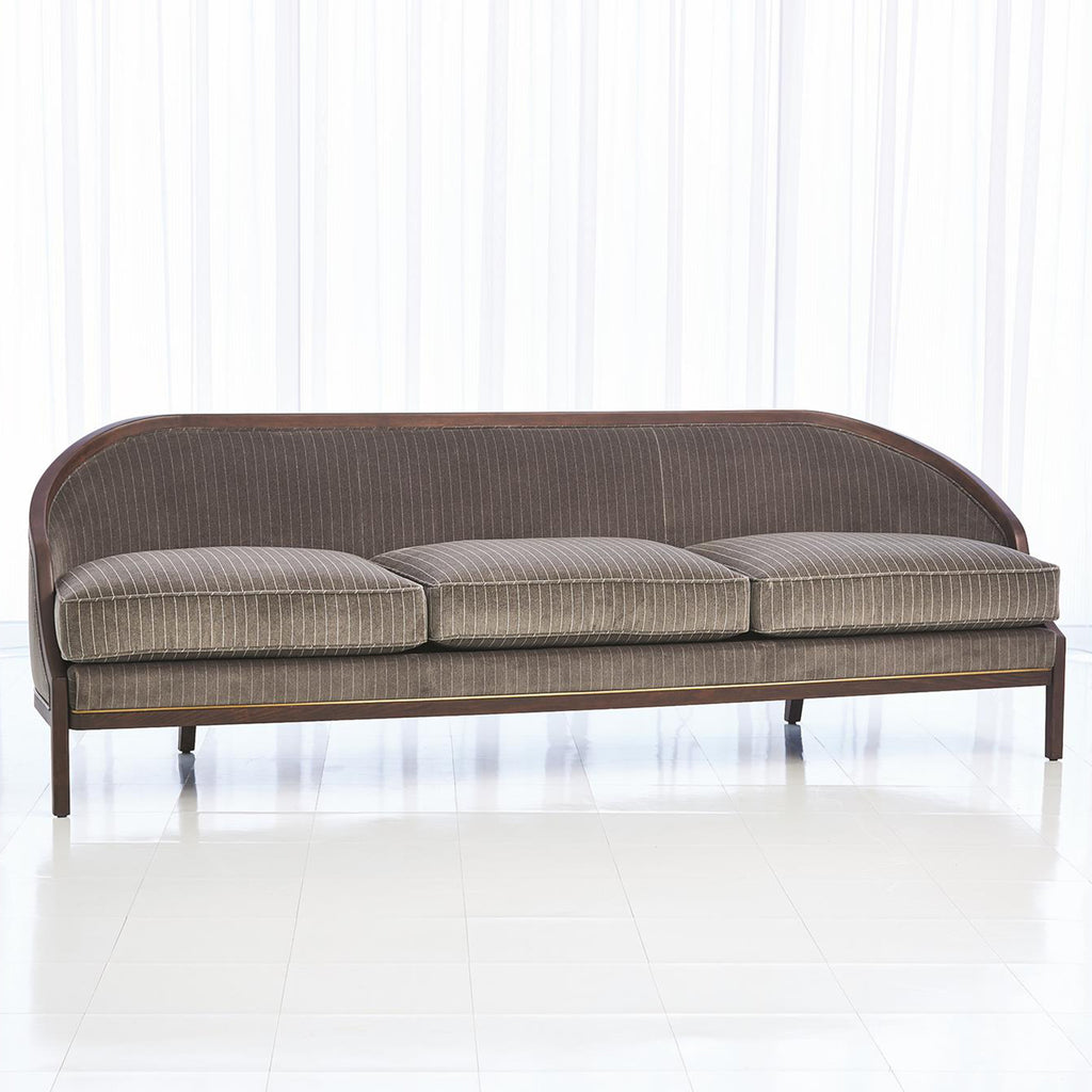 Global Views Tailored Sofa is distinguished by the sleek pinstripe fabric around the back support. A beautiful wooden base supports the sofa and is accentuated along the bottom edge with a filet of solid brass running around the entire frame of the sofa. Elegant shapely legs and frame are finished in a dark waxed oiled walnut finish.