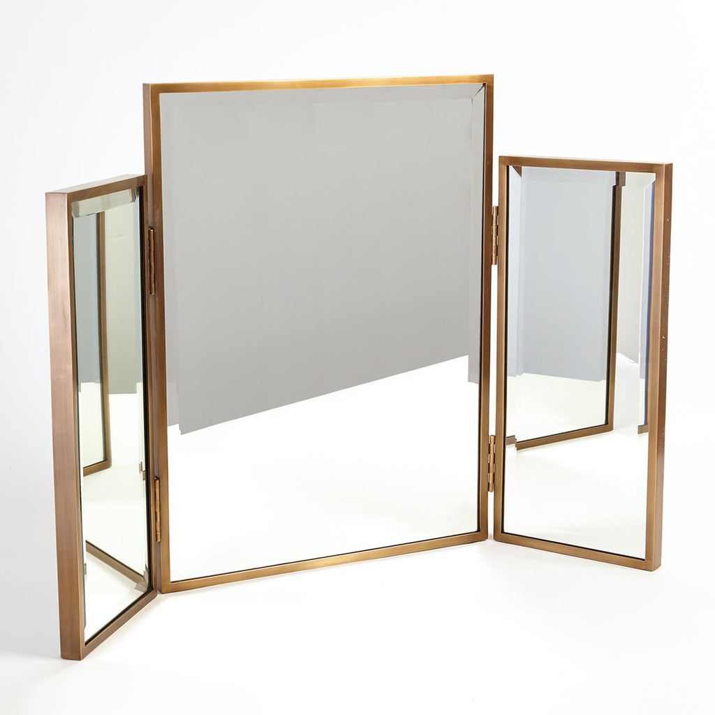Our Global Views Tri-Fold Vanity Mirror features three, double-sided mirror panels with a classic brass trim. See yourself from every angle with this classic mirror.