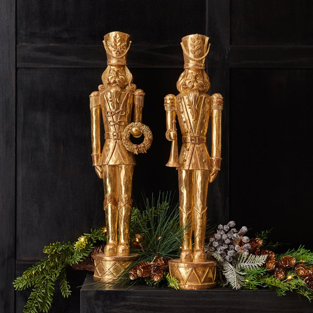 Ring in the holiday season with this stunning set of Nutcracker Statues. Featuring two assorted designs, this set is a great fit for your traditional or modern style of decor. The chic gold tones paired with the classic nutcracker character are the perfect combination to create a memorable display. The quality resin composition is sure to endure for seasons to come. Display the pieces on your mantle or tabletop display to make a statement in your home.