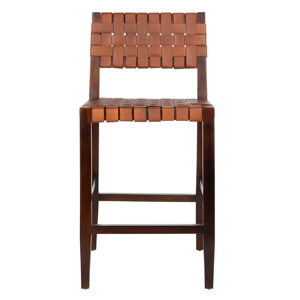This contemporary Goshen woven leather counter stool brings modern luxury to any open plan living space or kitchen. Crafted with classic cognac leather, its mahogany wood features a beautiful walnut finish for a timeless design.