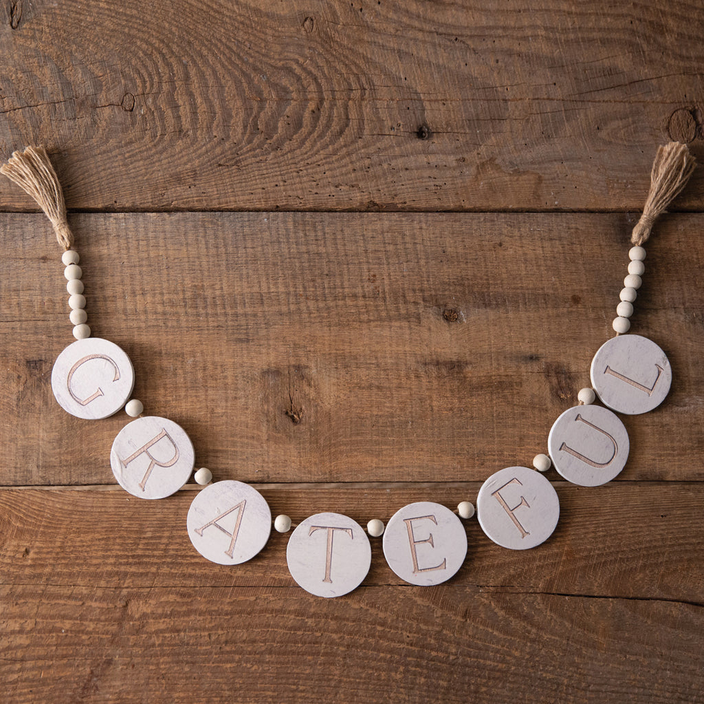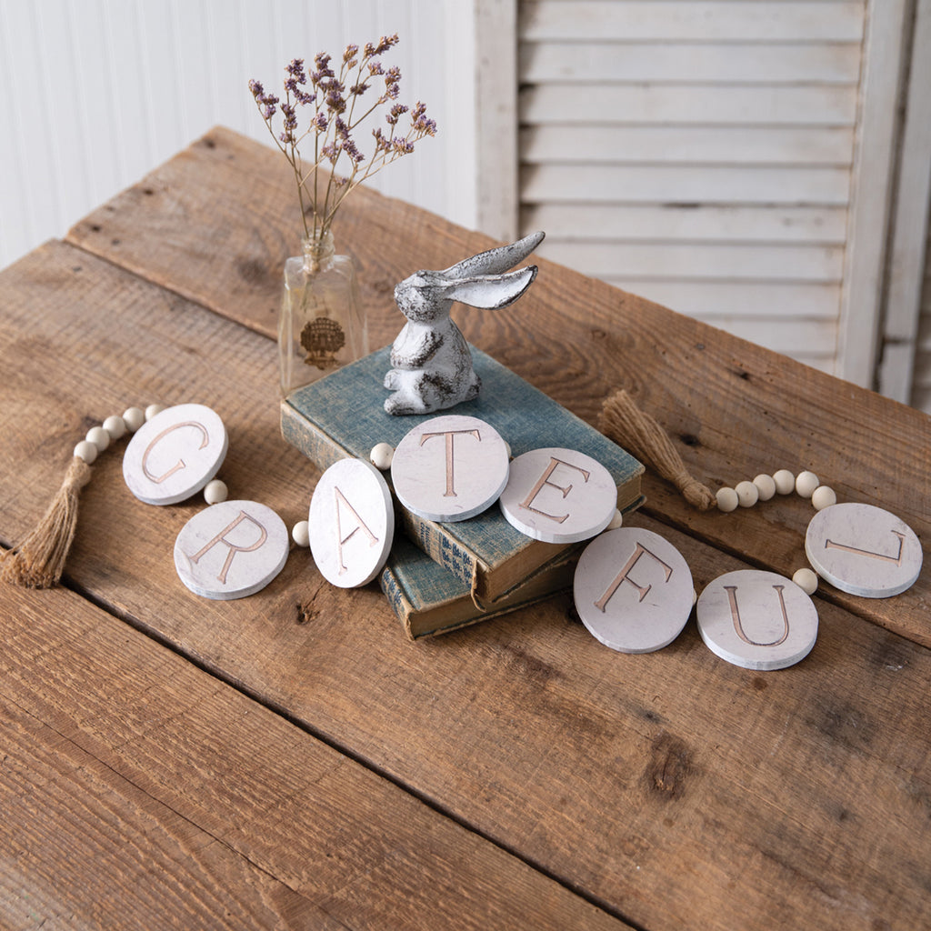 Be grateful! Use these beads to add texture and charm to a two-tier tray, wall, or any way you can imagine. Each strand has wood beads intertwined with a spring message and jute tassels on the ends.