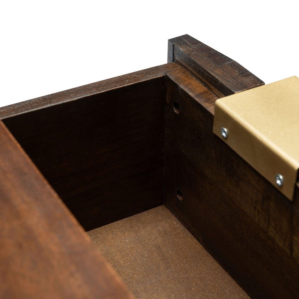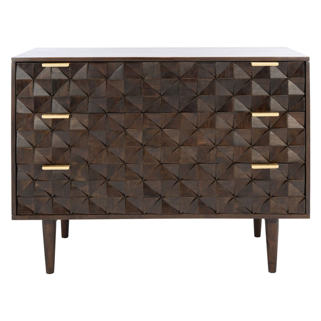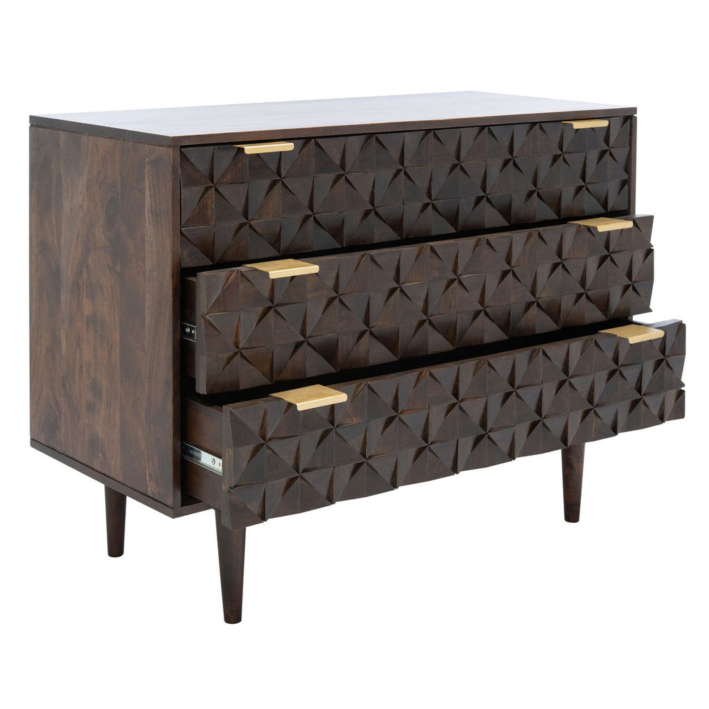The finely carved geometric details of this chest give it a distinct couturier look, elevating your décor to new heights of style. The three ample drawers feature artfully faceted sculptured accents beautifully highlighted by a deep walnut finish, making it perfect for any room’s color scheme.
